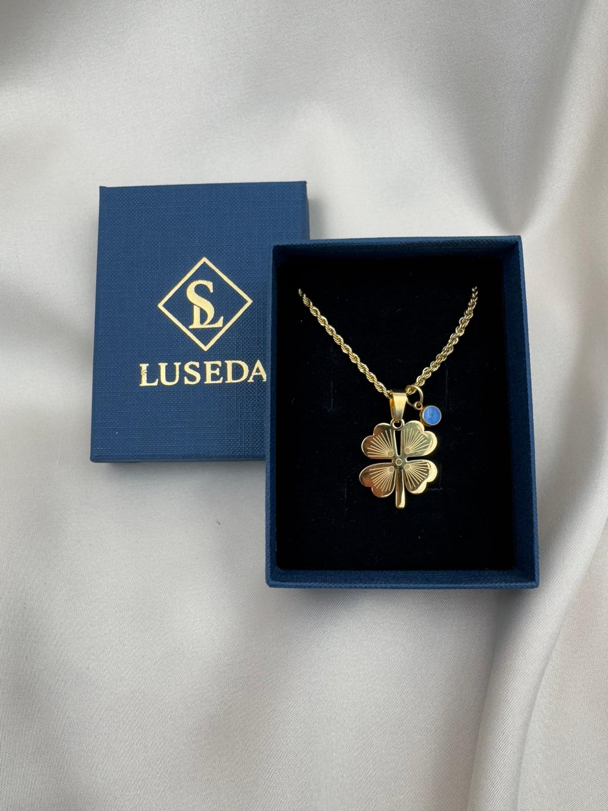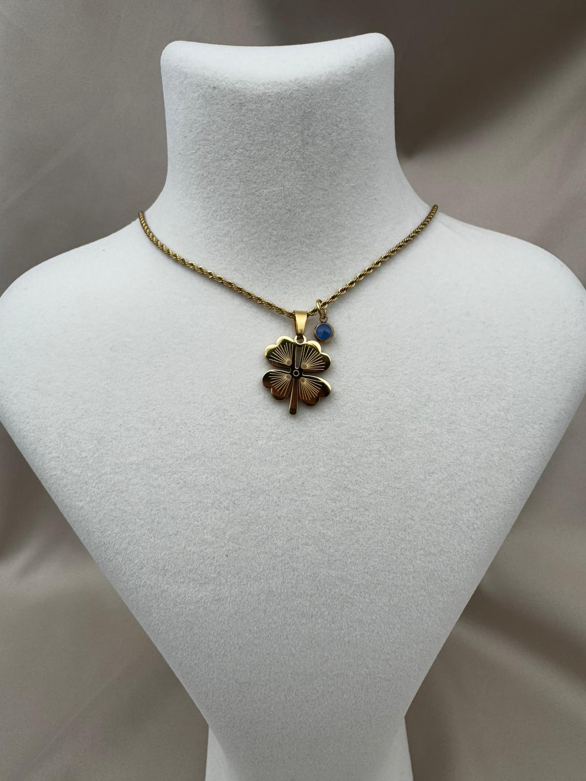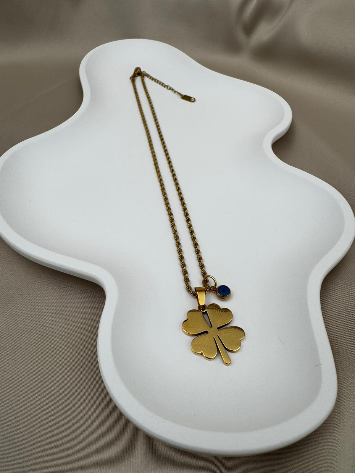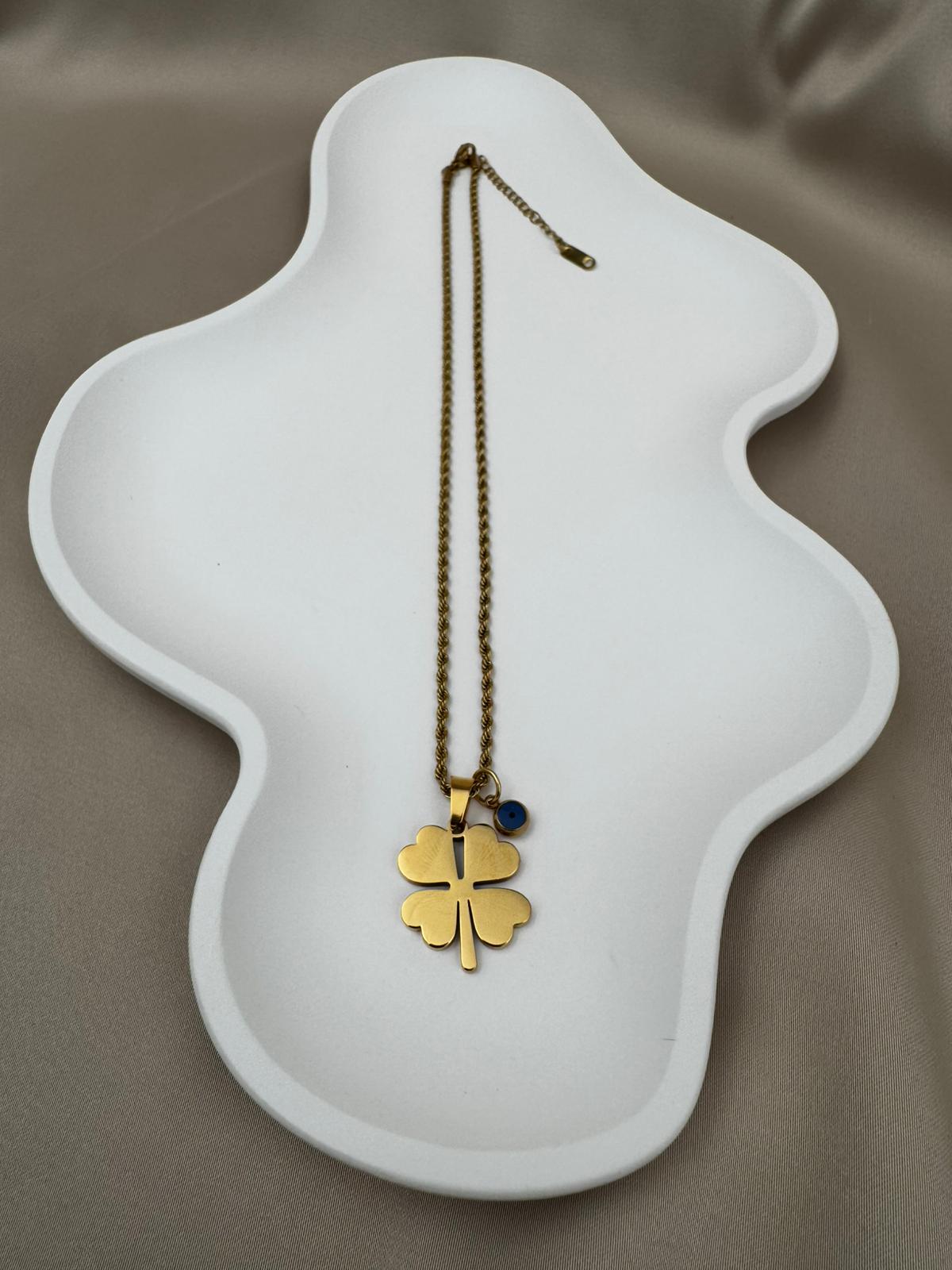 Şans ve zarafeti bir arada sunan bu özel tasarım kolye, dört yapraklı yoncanın uğur getiren simgesini nazar boncuğunun koruyucu etkisiyle tamamlıyor. Altın kaplama kararmaz çelikten üretilmiş zinciri sayesinde uzun yıllar ilk günkü parlaklığını korur. Hafif ve dayanıklı yapısıyla günlük kullanıma uygundur, özel günlerde de kombinlerinize şık bir dokunuş katar.