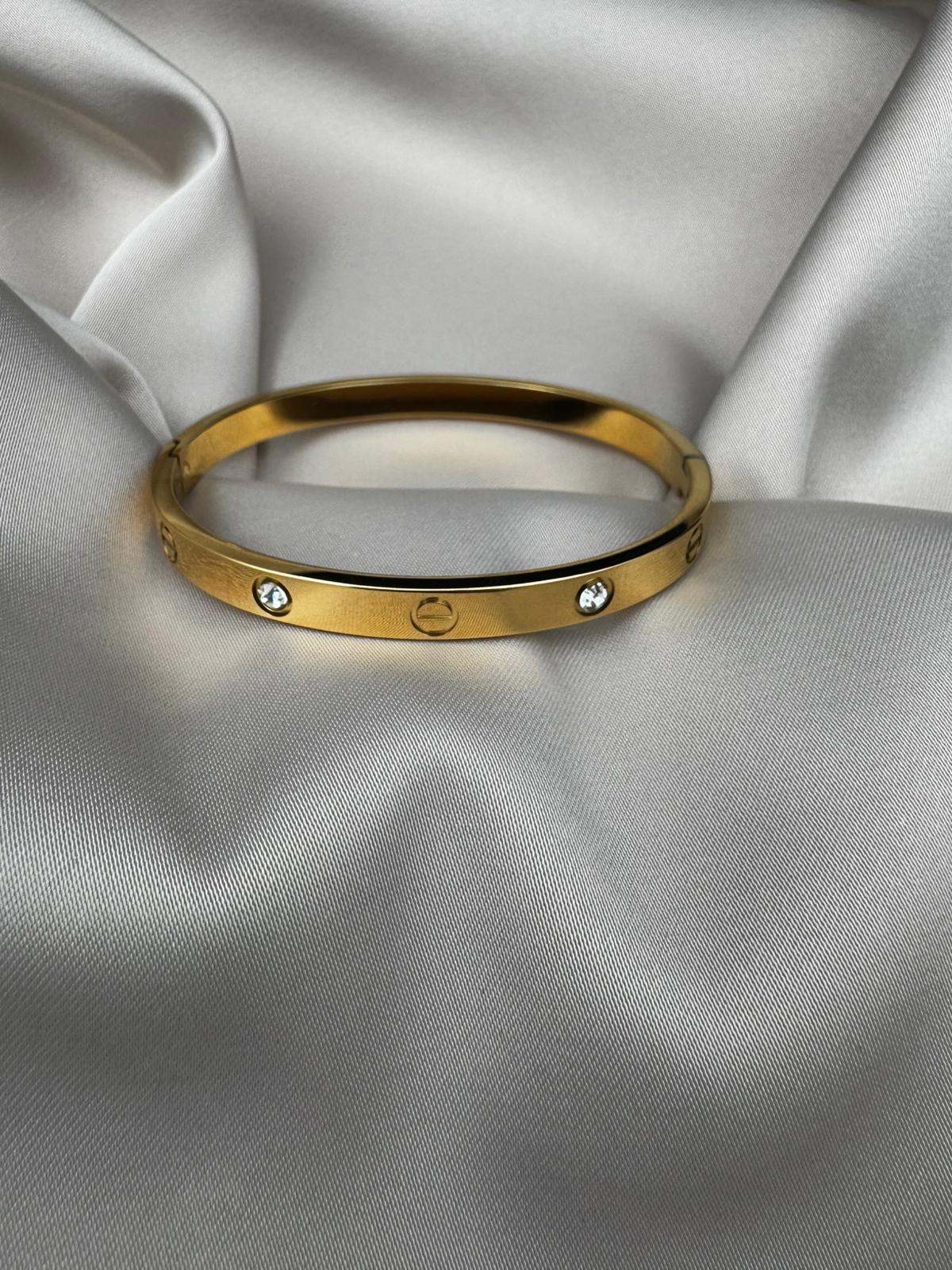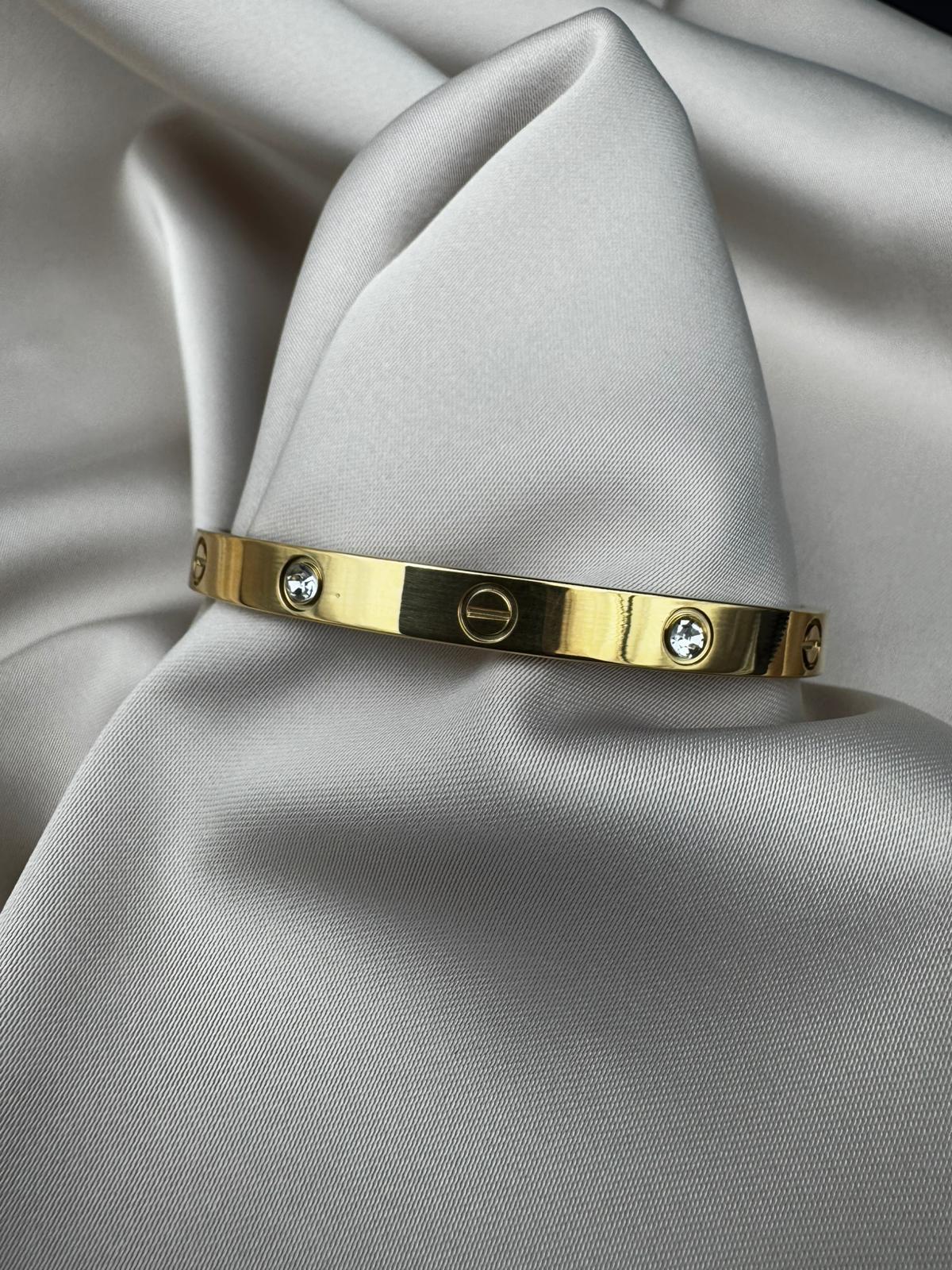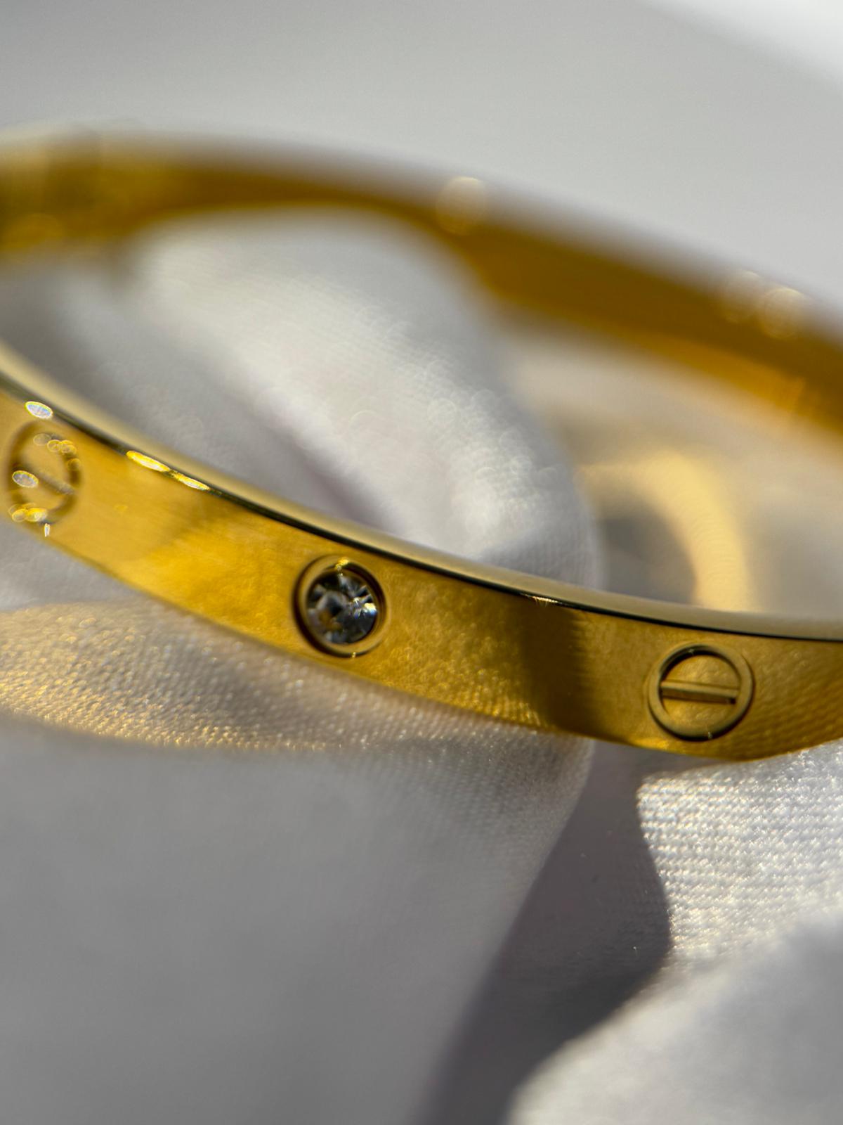 Zarafeti ve modernliği bir arada sunan bu altın renk bileklik, parlak taş detaylarıyla ışıltınızı ön plana çıkarır. Kararmaz çelik malzemeden üretilmiş olup uzun süreli kullanımda ilk günkü parlaklığını korur. Minimalist tasarımı sayesinde hem günlük hayatta hem de özel davetlerde stilinize sofistike bir dokunuş katar. Dayanıklı yapısı ve şık görünümüyle sevdiklerinize hediye etmek için de mükemmel bir tercihtir.