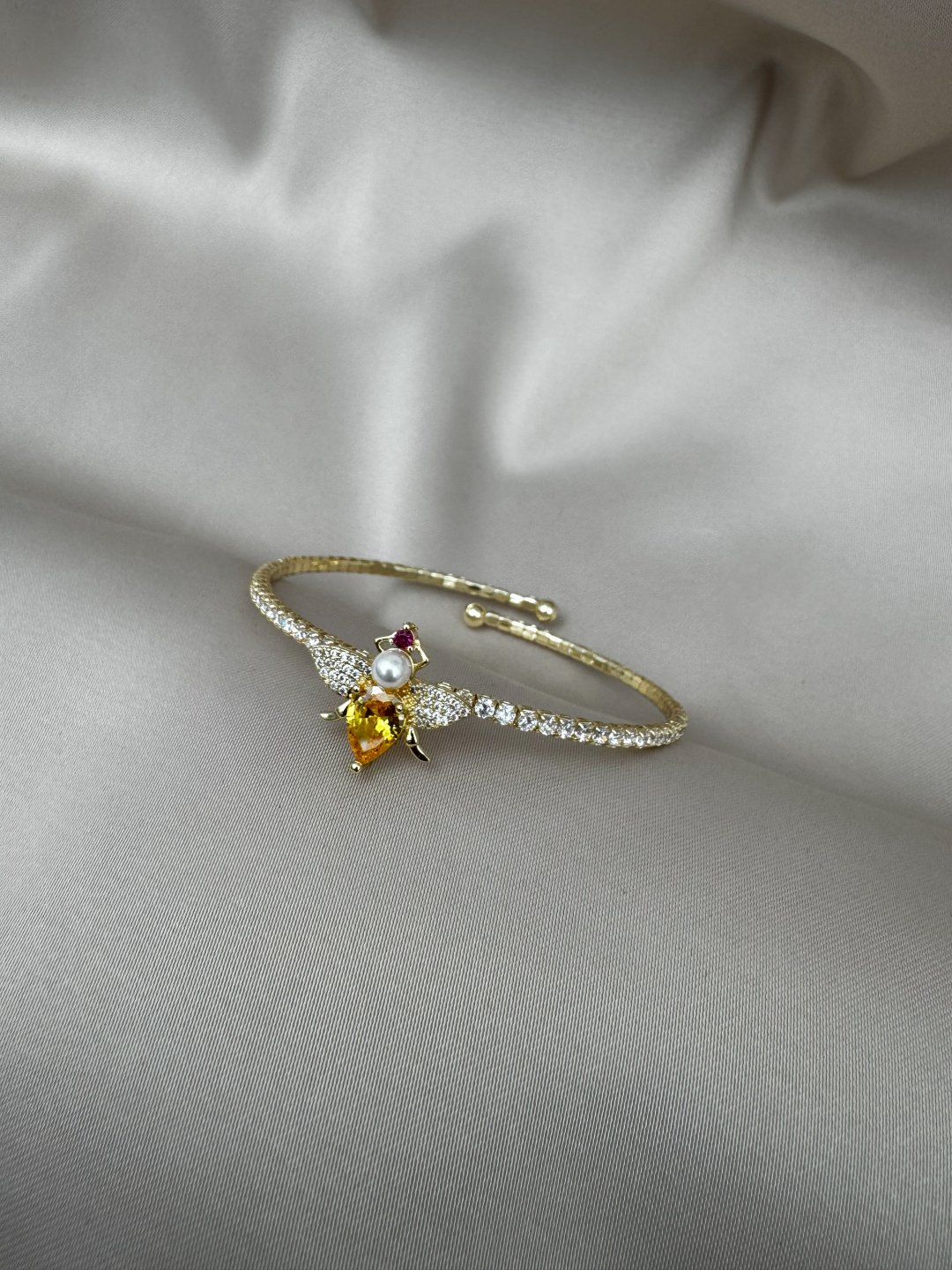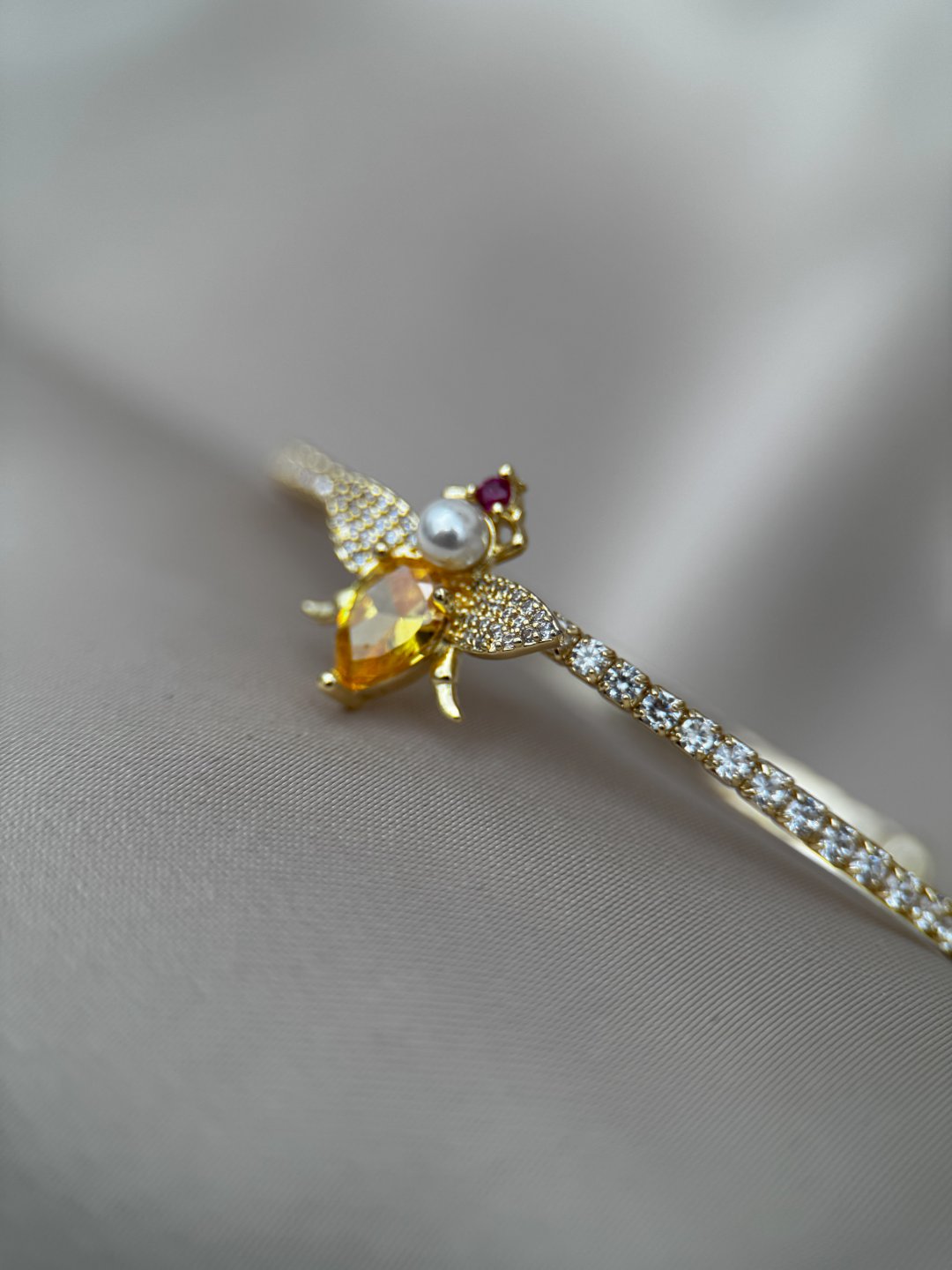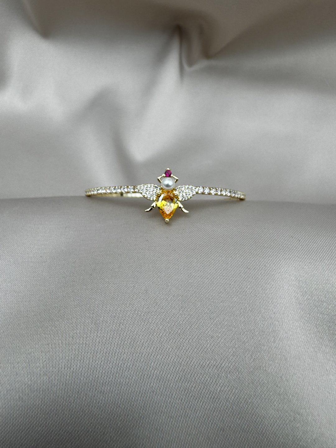 LUSEDA’nın zarif tasarım anlayışını yansıtan bu arı figürlü taşlı bileklik, doğadan ilham alan zarafeti modern bir çizgiyle buluşturuyor. Parlak zirkon taşlarla süslenmiş kanatlar, inci detayı ve sarı tonlu taş gövdesiyle bilekte göz kamaştırıcı bir ışıltı yaratır. Gold kaplama yapısı kararmaz özelliktedir ve uzun ömürlü kullanım sağlar.