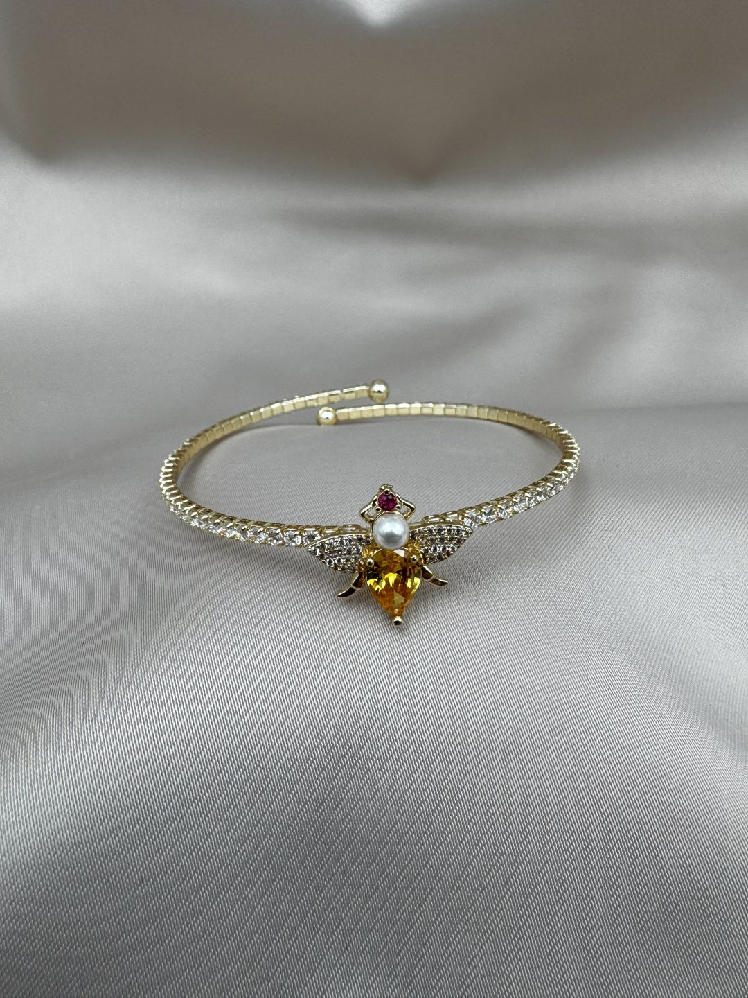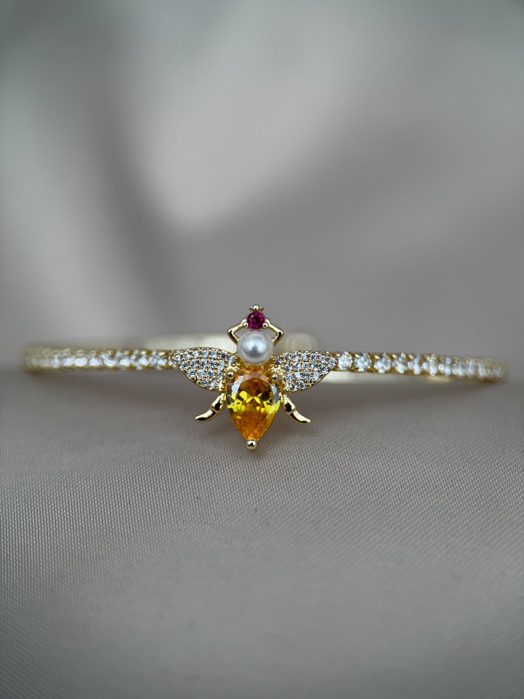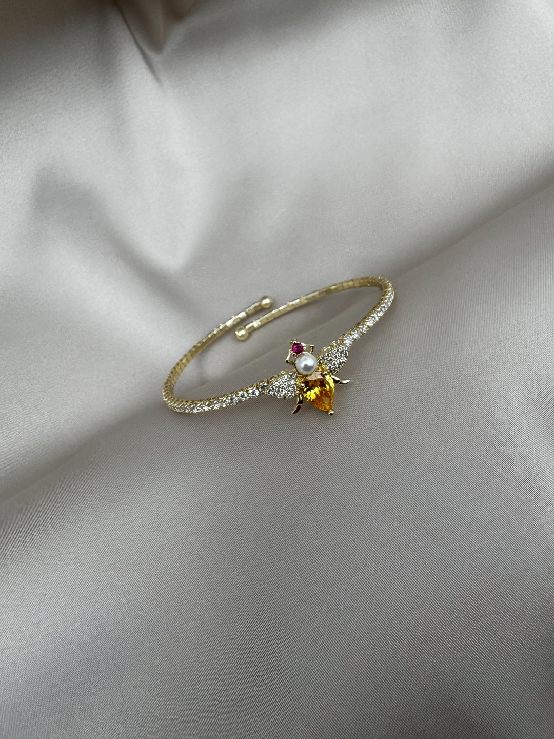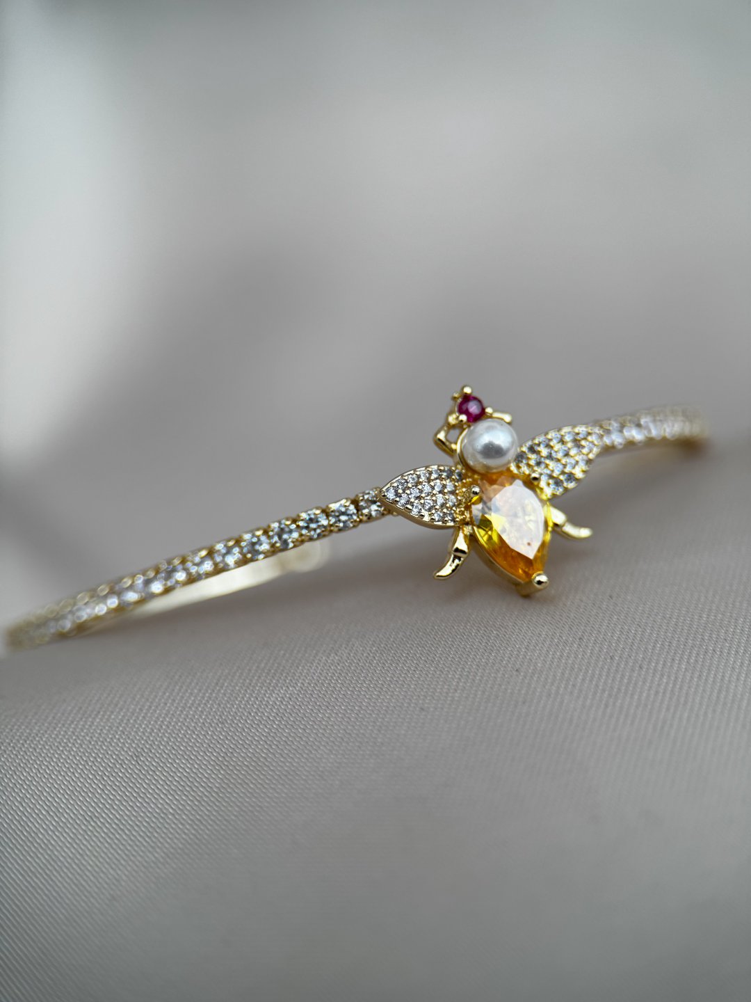 LUSEDA’nın zarif tasarım anlayışını yansıtan bu arı figürlü taşlı bileklik, doğadan ilham alan zarafeti modern bir çizgiyle buluşturuyor. Parlak zirkon taşlarla süslenmiş kanatlar, inci detayı ve sarı tonlu taş gövdesiyle bilekte göz kamaştırıcı bir ışıltı yaratır. Gold kaplama yapısı kararmaz özelliktedir ve uzun ömürlü kullanım sağlar.