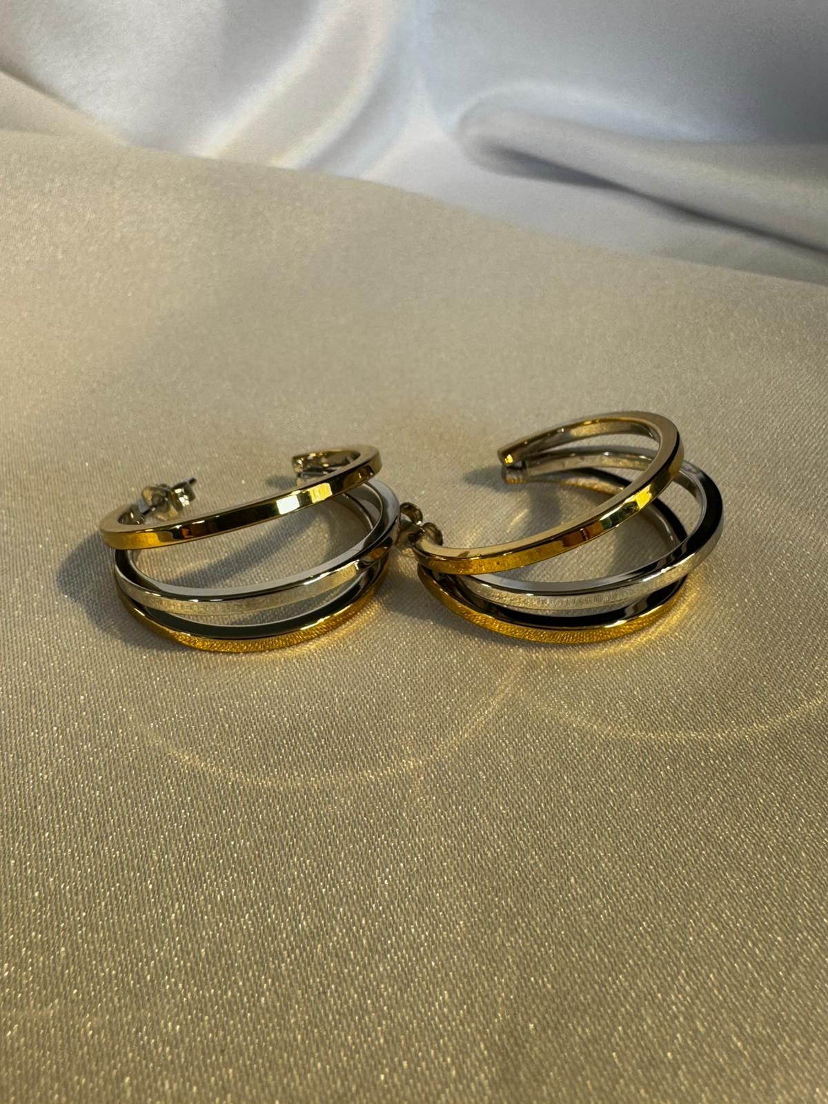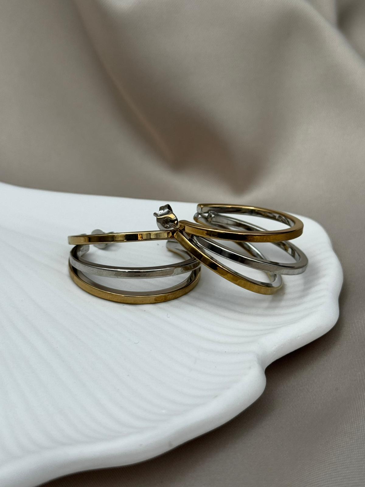 Zarif ve modern tarzı bir araya getiren bu gold ve silver tonlarında üçlü halka küpe, günlük kullanımda olduğu kadar özel günlerde de şıklığınızı tamamlayacak. Kararmayan kaliteli çelik malzemeden üretilen küpe, uzun ömürlü ve dayanıklı yapısıyla dikkat çeker. Üç farklı halkanın uyumlu birleşimi, sofistike ve trend bir görünüm sunar. Hafif yapısı sayesinde kulakta ağırlık yapmaz ve gün boyu rahat kullanım sağlar.