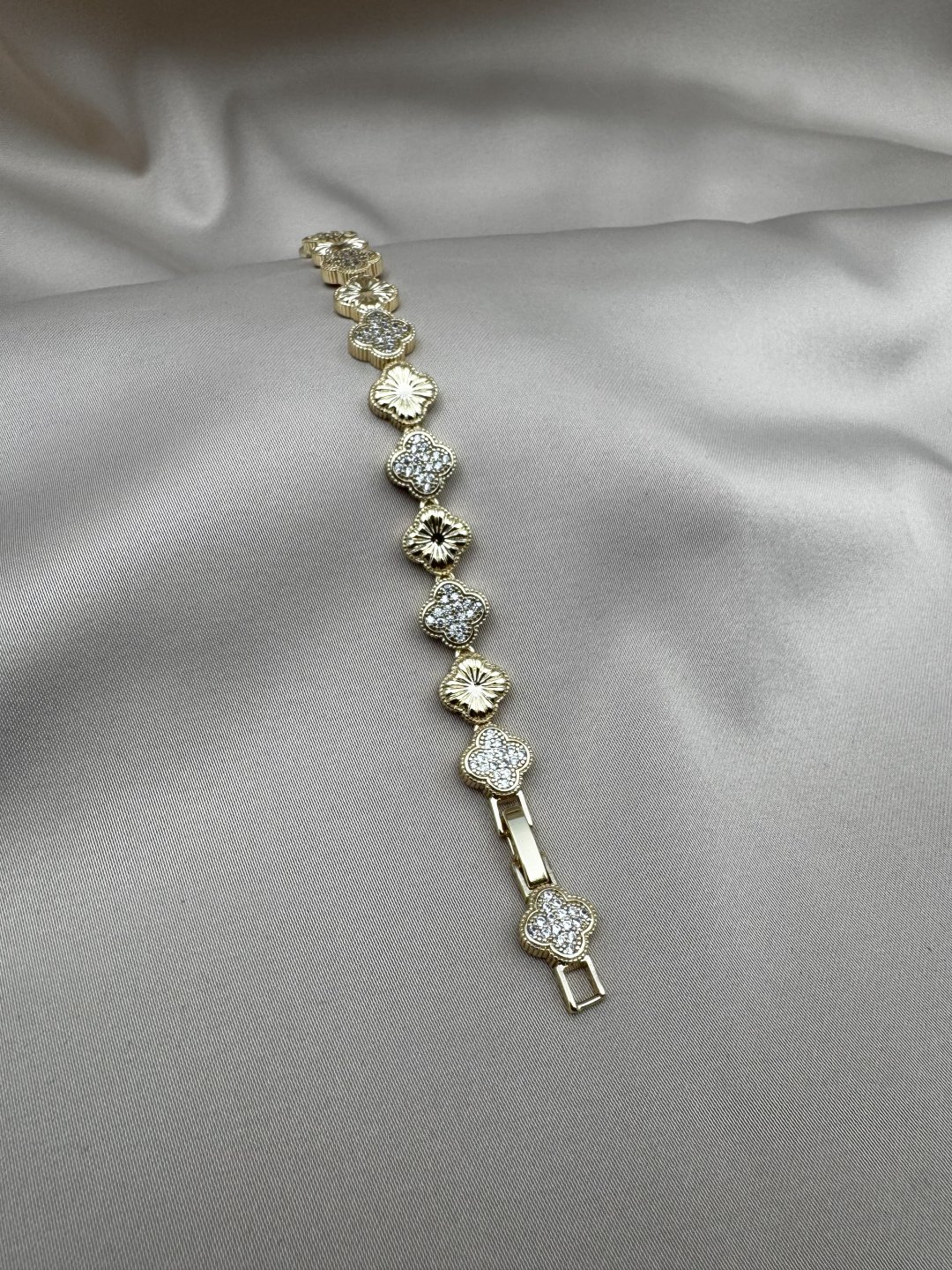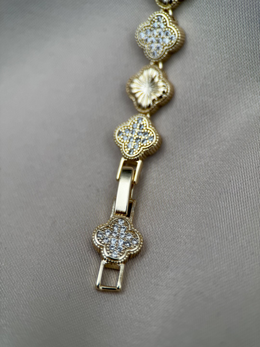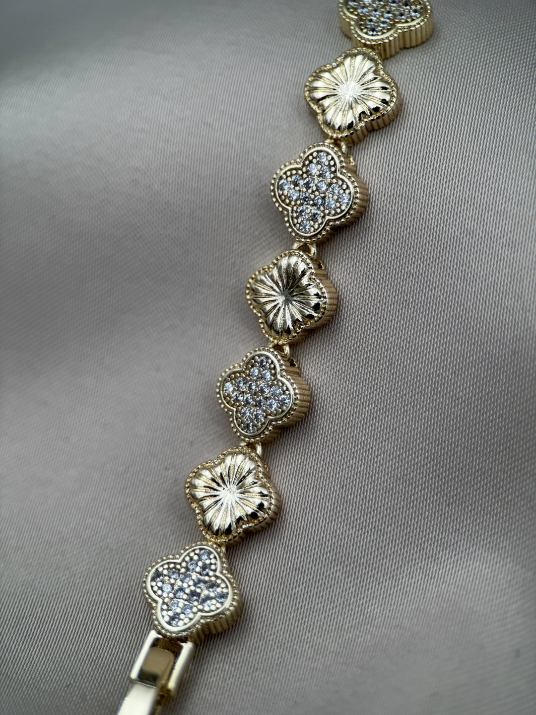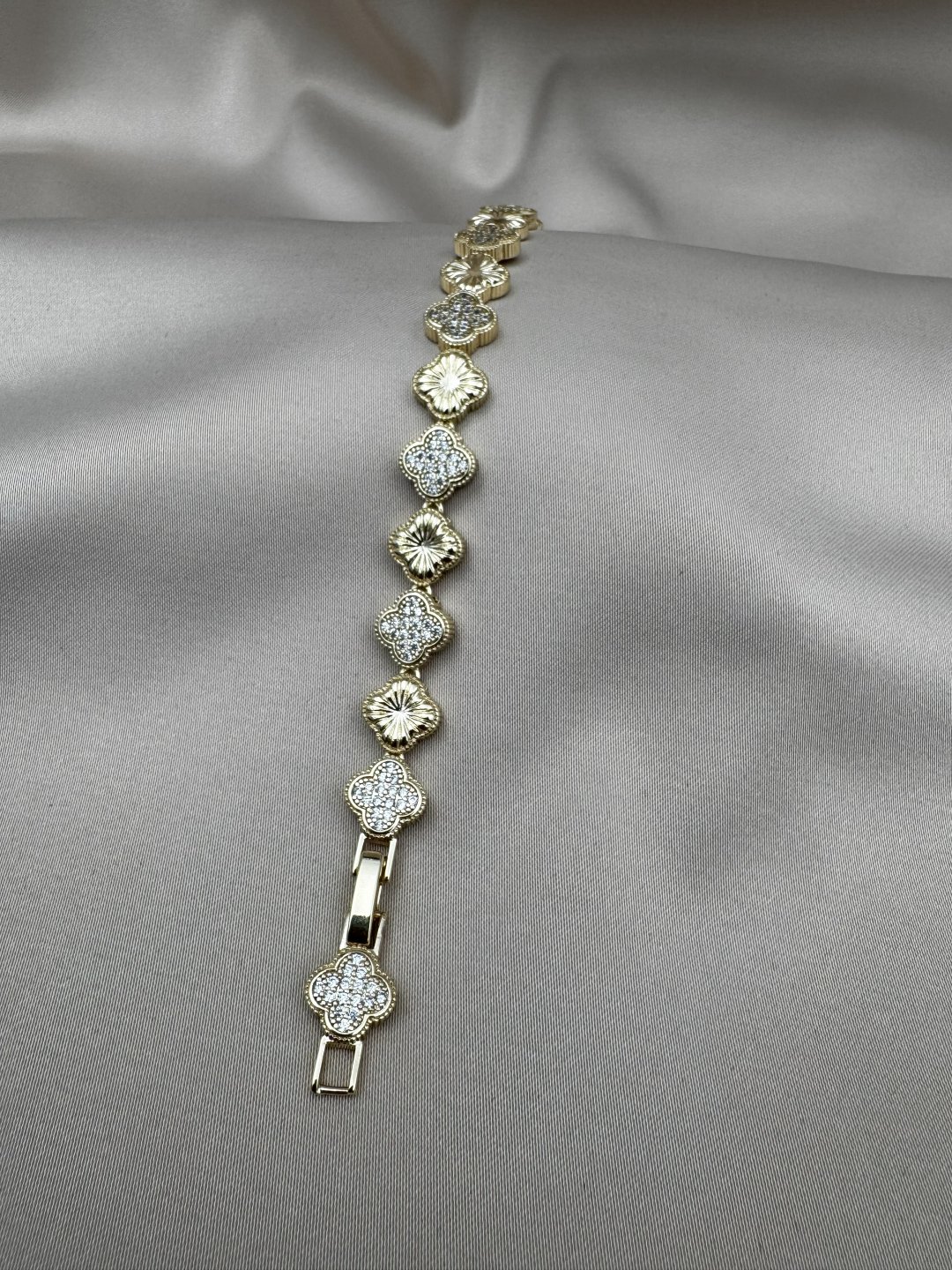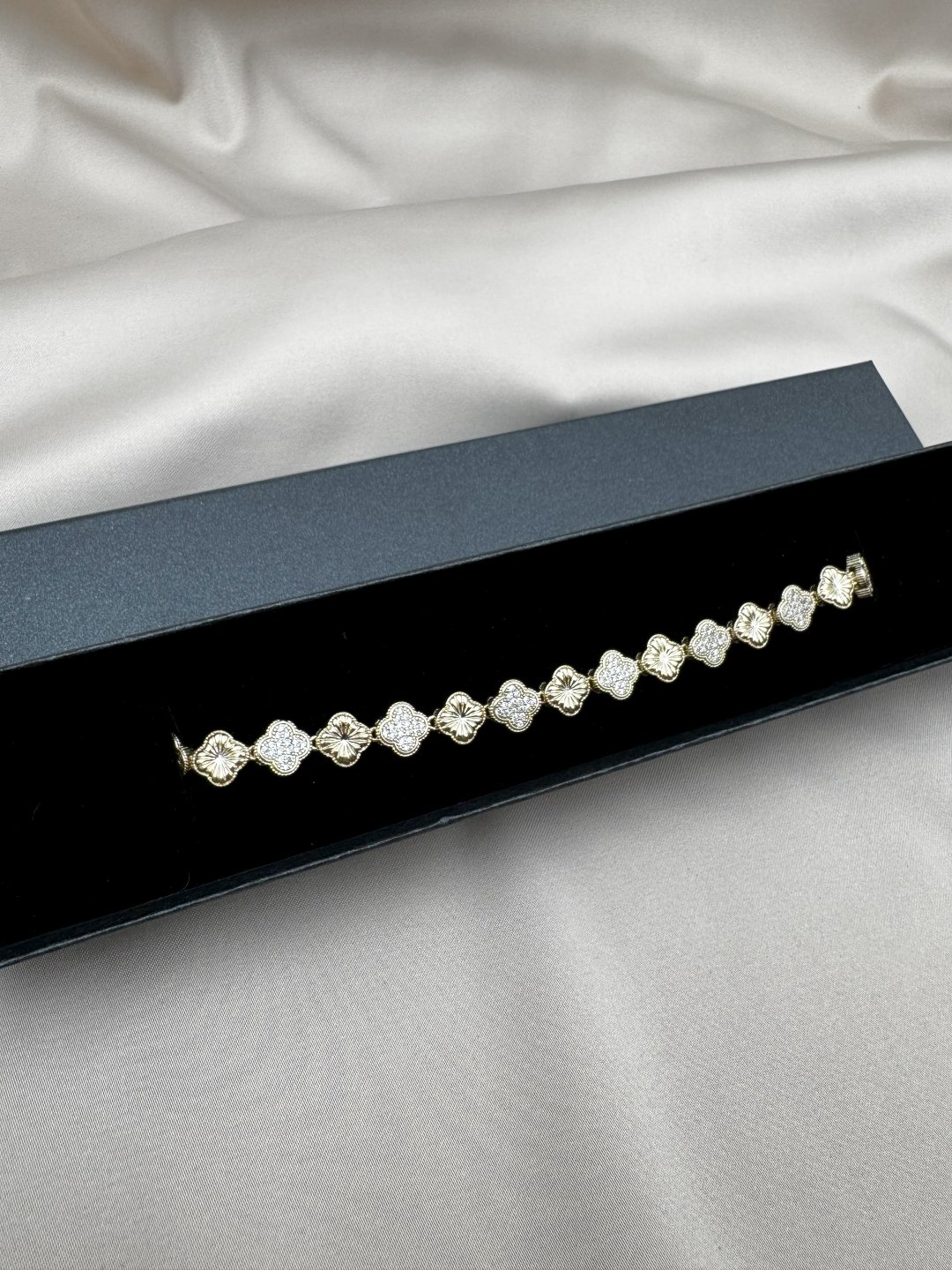 LUSEDA’nın göz alıcı tasarımıyla öne çıkan bu dört yapraklı taşlı bileklik, zarafet ve ışıltının kusursuz birleşimini sunar. Parlak zirkon taşlar ve gold kaplama detaylarıyla hazırlanan bu özel model, her bilekte şık ve lüks bir duruş sergiler. Kararmaz yapısı sayesinde uzun ömürlü kullanım sağlar ve ilk günkü parlaklığını korur.