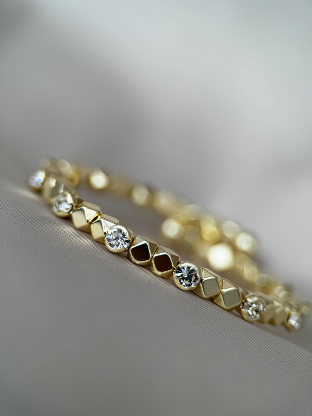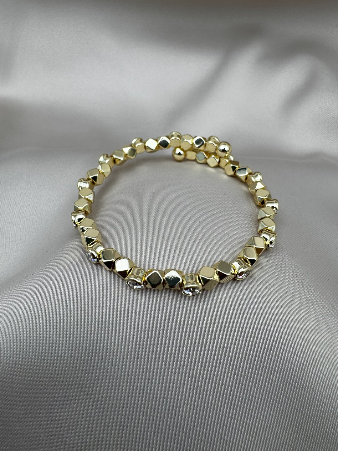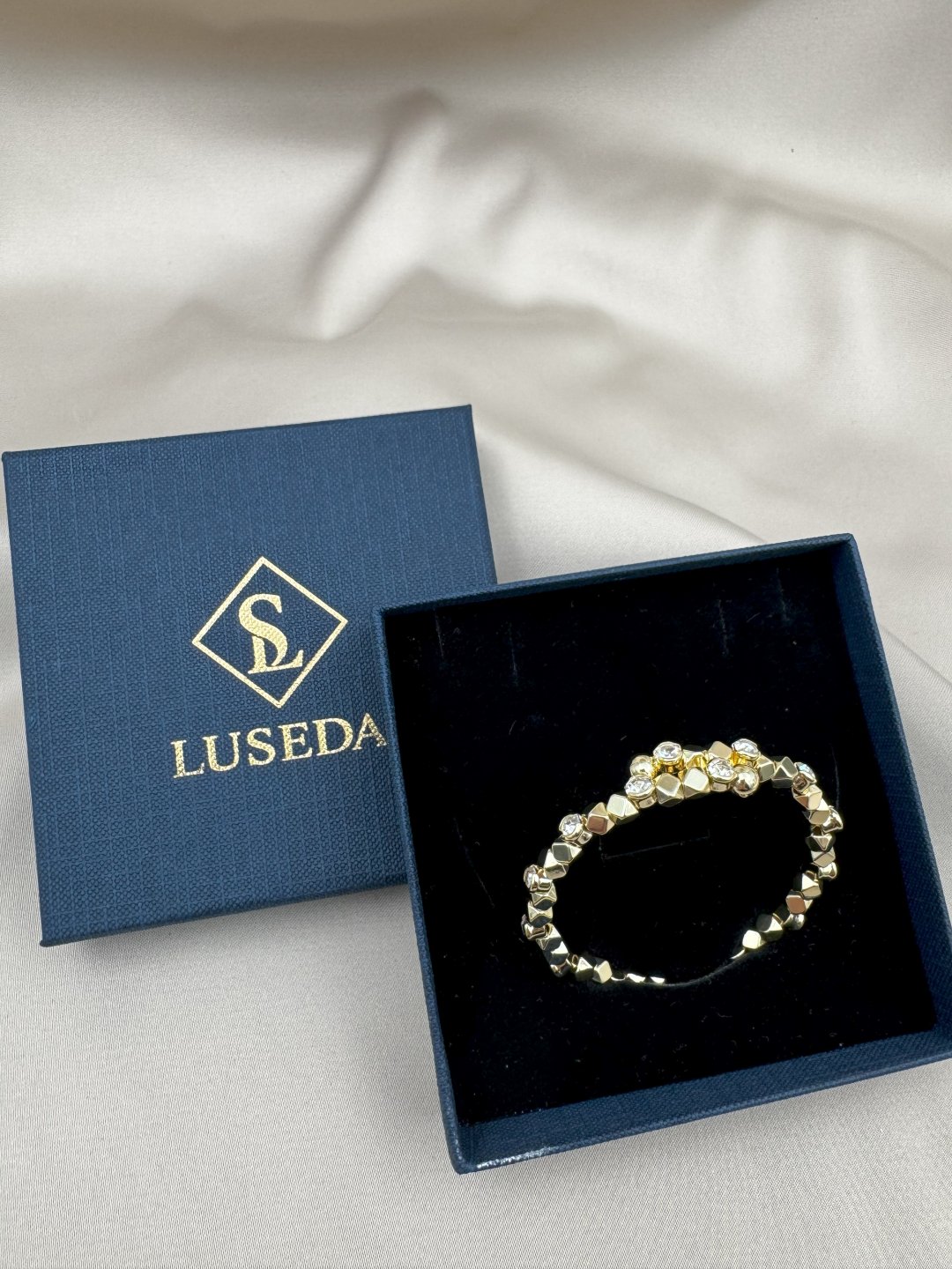 LUSEDA’nın zamansız şıklığını yansıtan bu gold bileklik, geometrik formlu parlak detayları ve aralara yerleştirilmiş taş süslemeleriyle modern bir ışıltı sunar. Kararmaz metal yüzeyi sayesinde uzun ömürlü kullanım sağlar, parlaklığını ilk günkü gibi korur. Esnek formu sayesinde bileğe kolayca oturur ve gün boyu konforlu bir kullanım sunar.