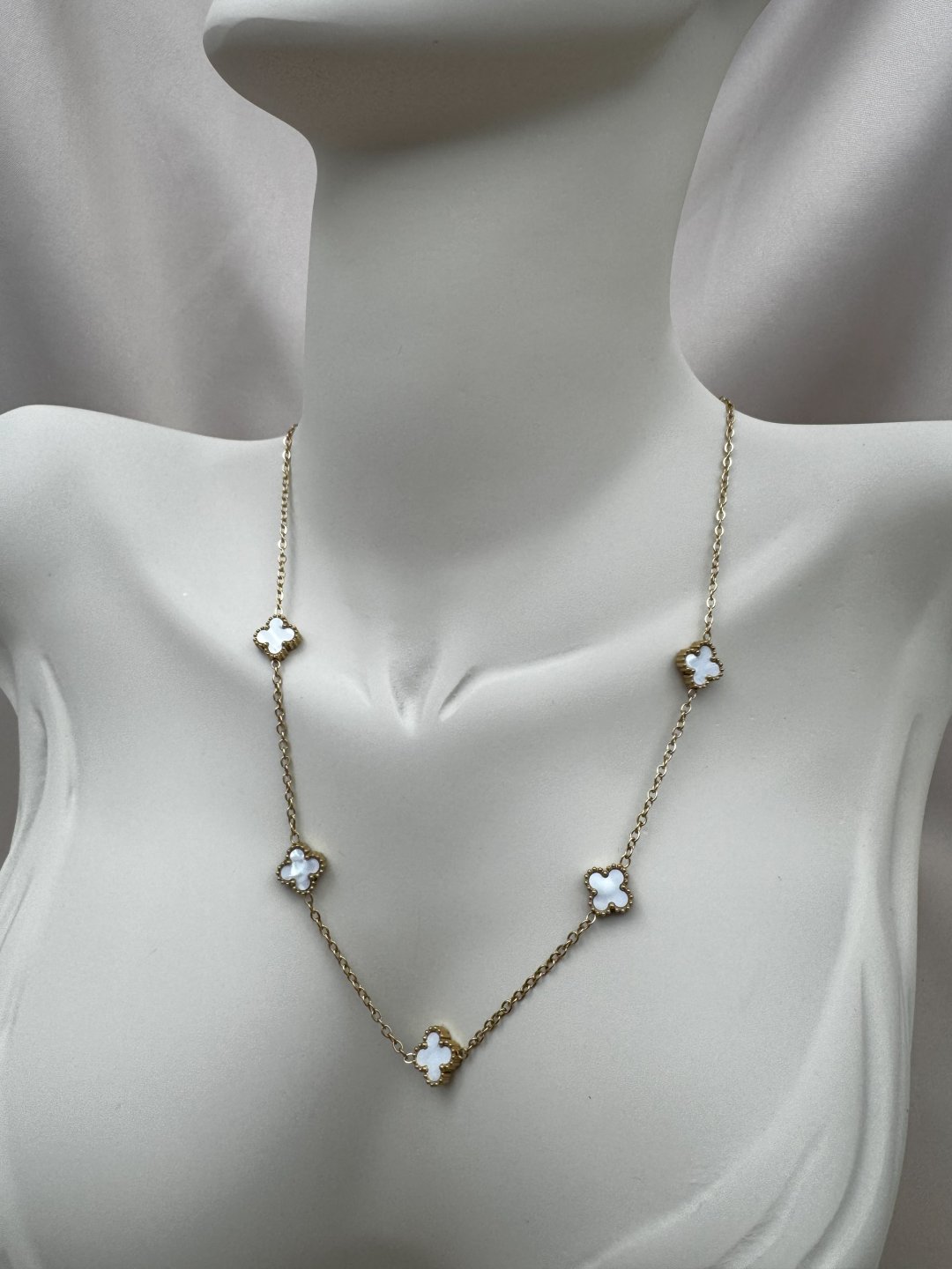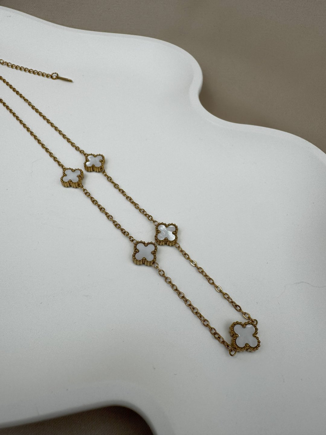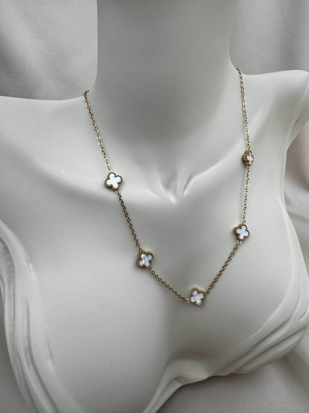 LUSEDA’nın lüks dokunuşuyla tasarlanan bu özel kolye, altın renk çelik zinciri ve beyaz sedef görünümlü yonca detaylarıyla zarif bir ışıltı sunar. Kararmaz, yüksek kaliteli çelik yapısı sayesinde uzun yıllar parlaklığını korur ve alerji yapmaz.