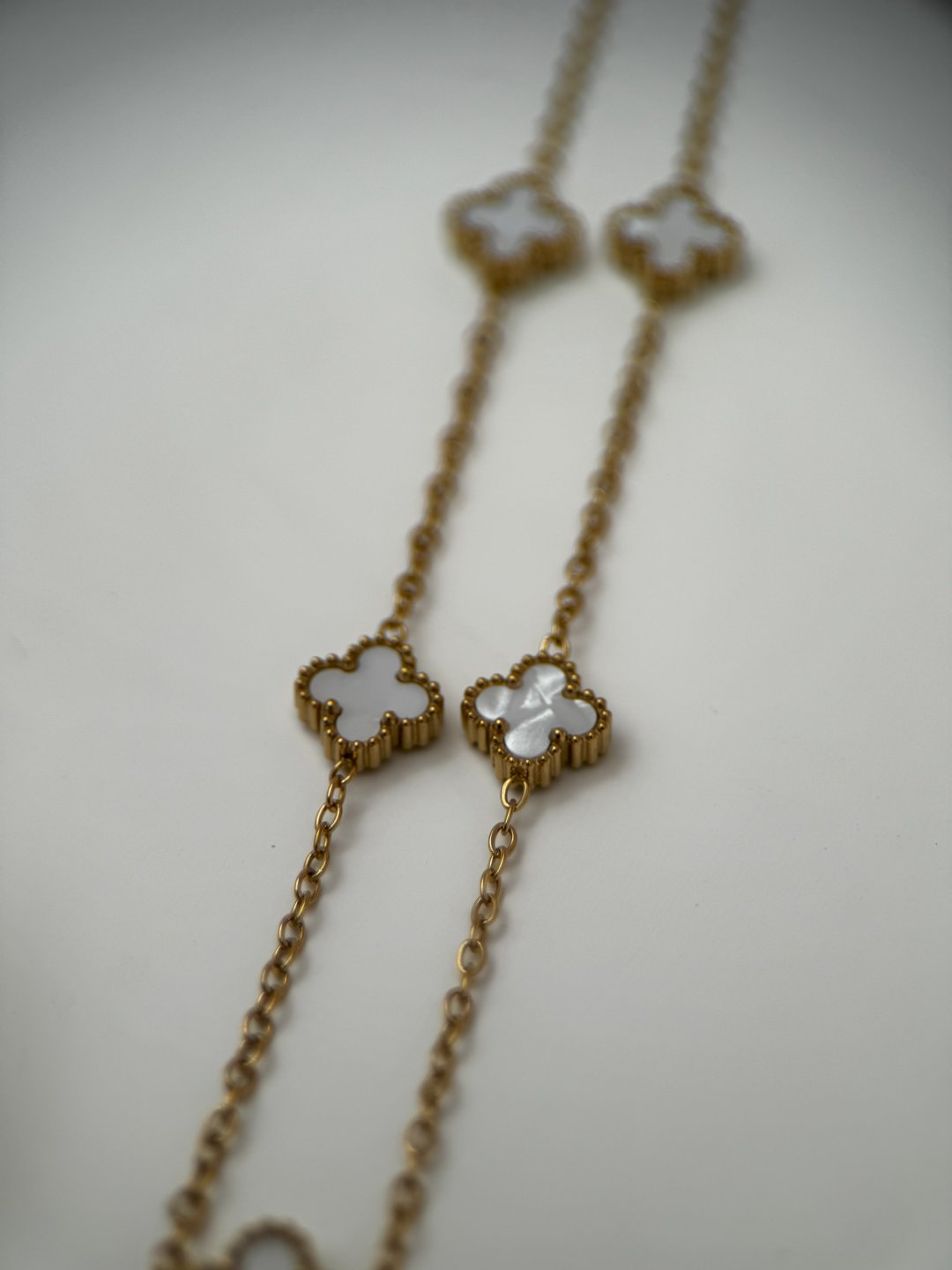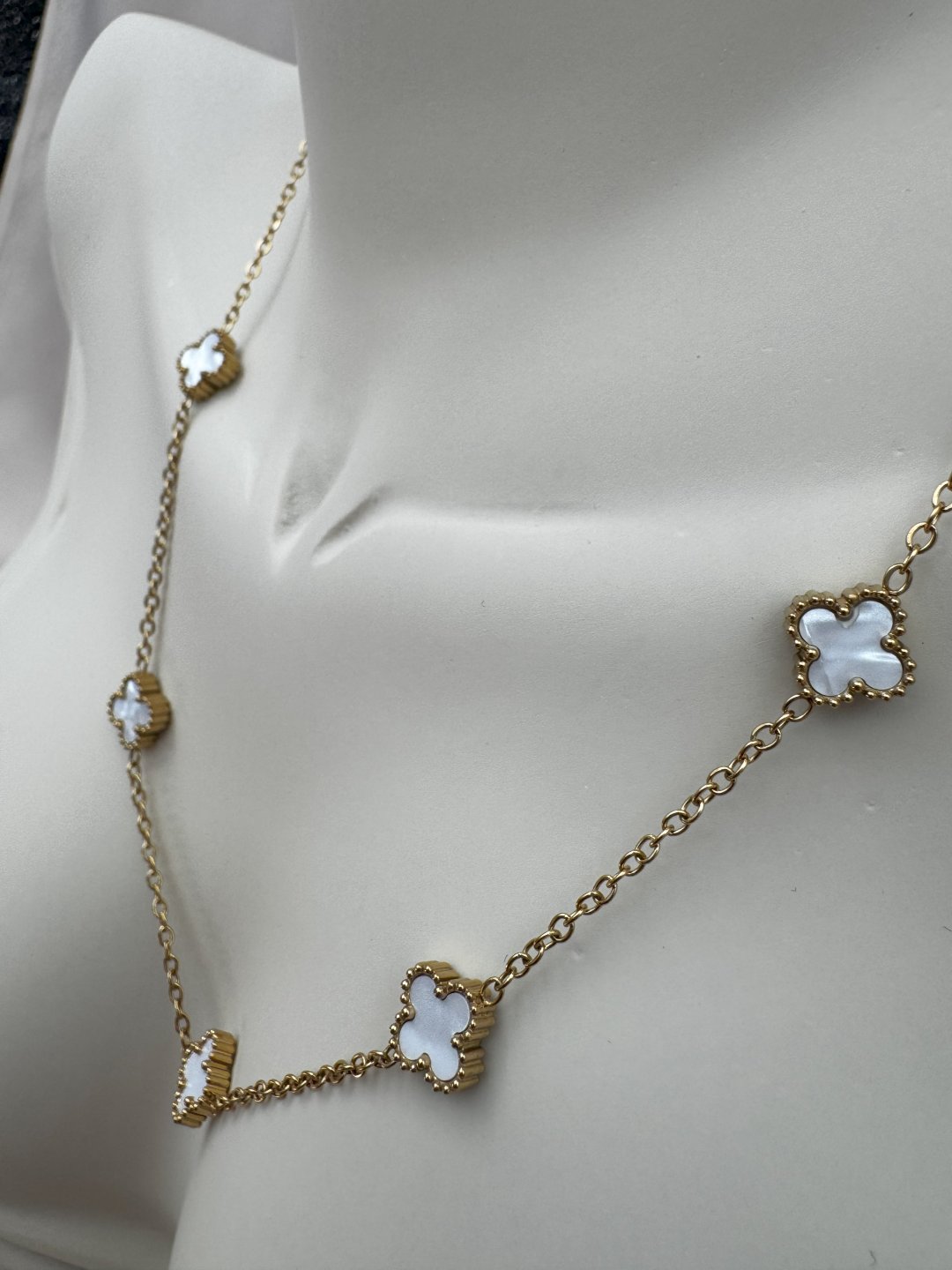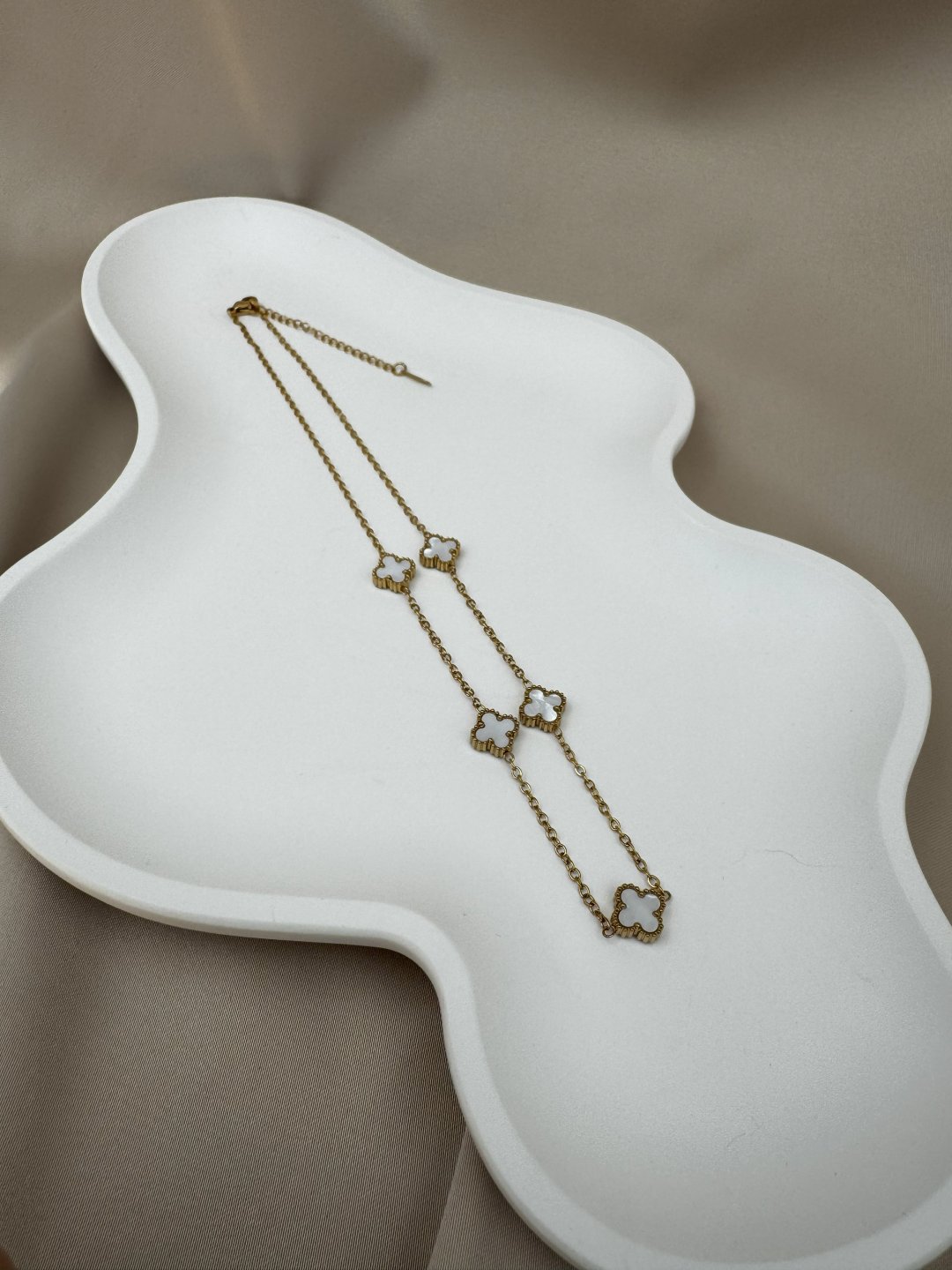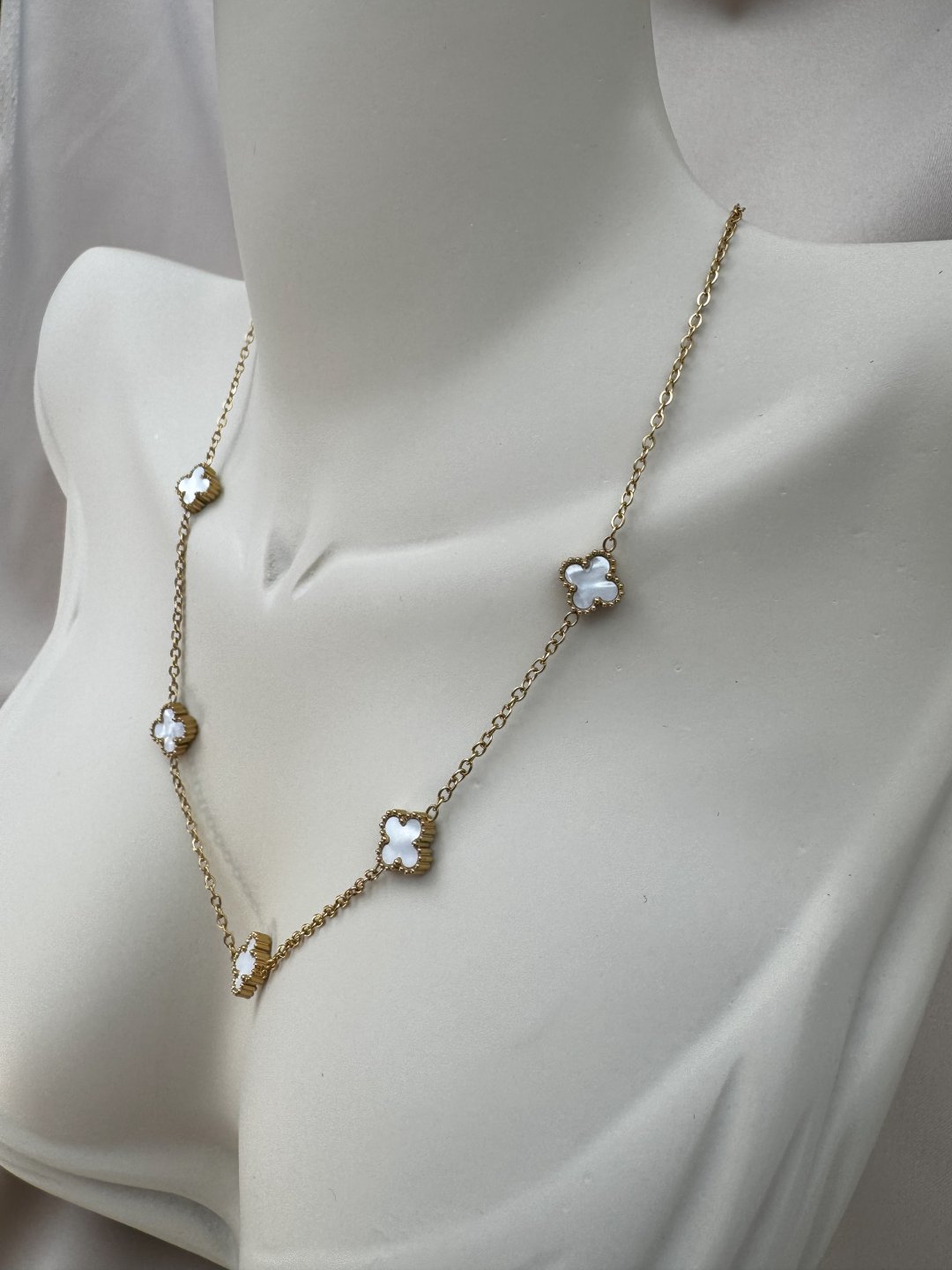 LUSEDA’nın lüks dokunuşuyla tasarlanan bu özel kolye, altın renk çelik zinciri ve beyaz sedef görünümlü yonca detaylarıyla zarif bir ışıltı sunar. Kararmaz, yüksek kaliteli çelik yapısı sayesinde uzun yıllar parlaklığını korur ve alerji yapmaz.