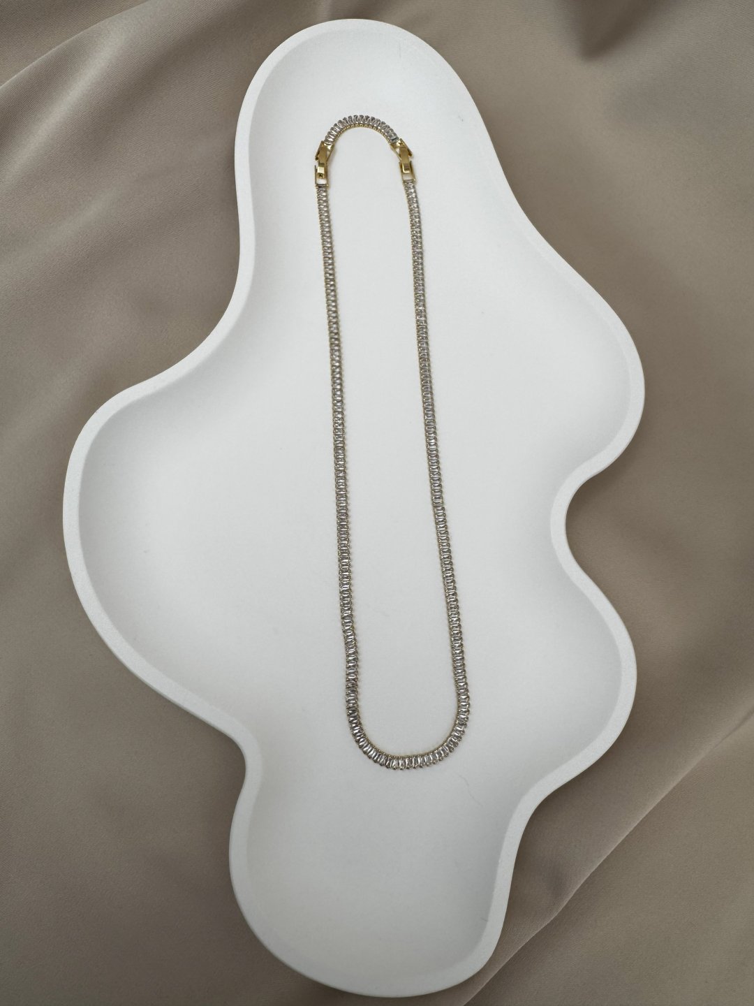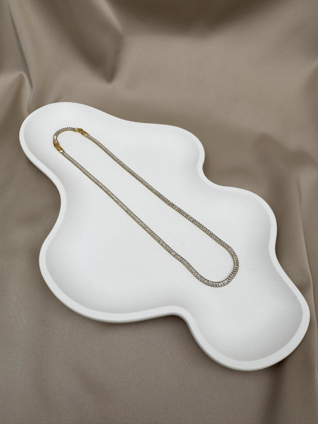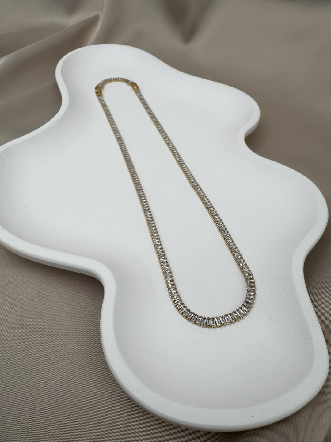LUSEDA’nın lüks detaylarla tasarladığı bu gold baget taşlı kolye, zarif ışıltısı ve modern formuyla dikkat çeker. Her biri özenle yerleştirilmiş baget taşlar, ışığı kusursuz şekilde yansıtarak boyun hattına sofistike bir parlaklık katar. Kaliteli yapısı sayesinde uzun ömürlü kullanım sunar; cilt dostu yapısı ile alerji riskini en aza indirir.