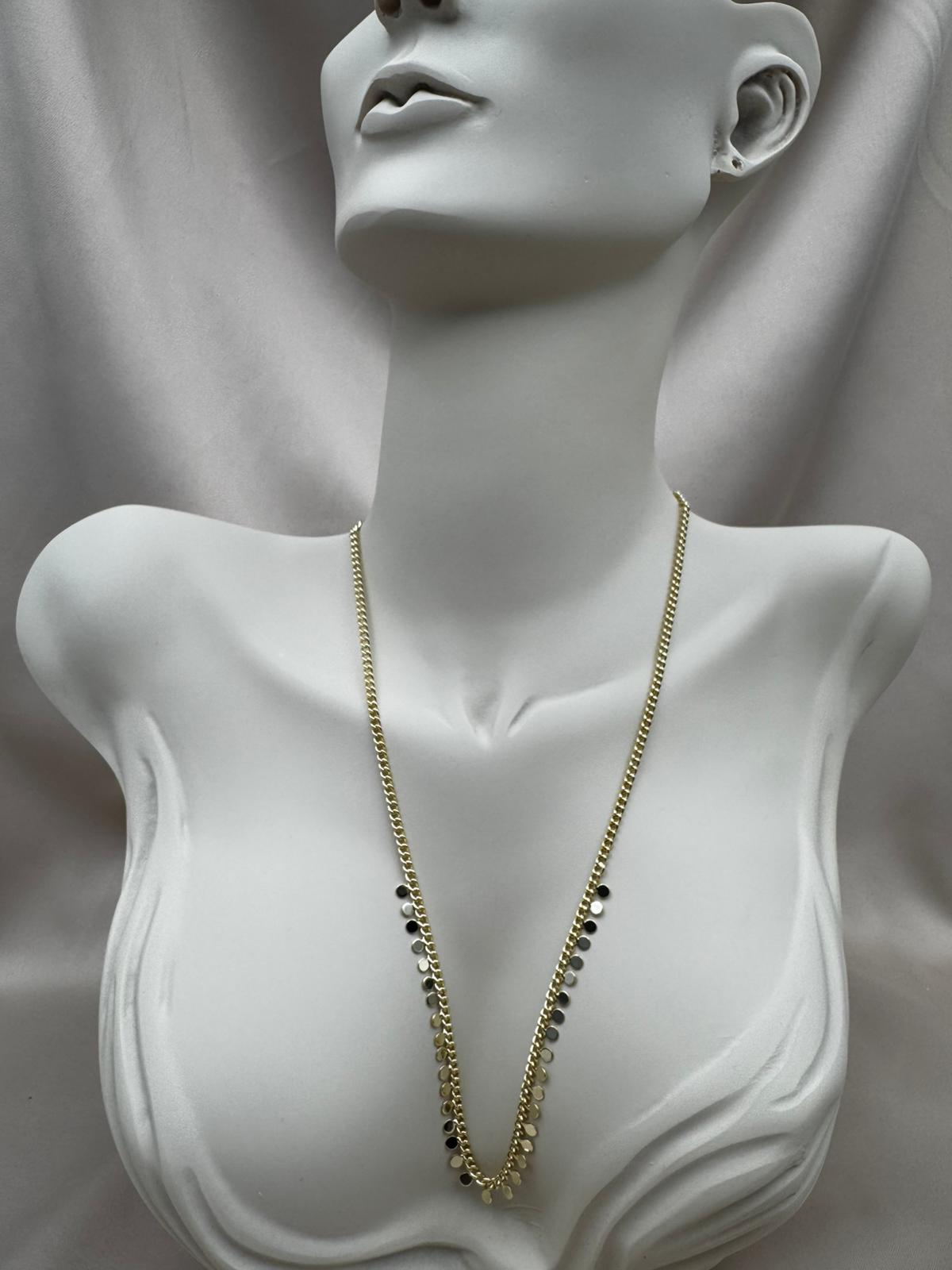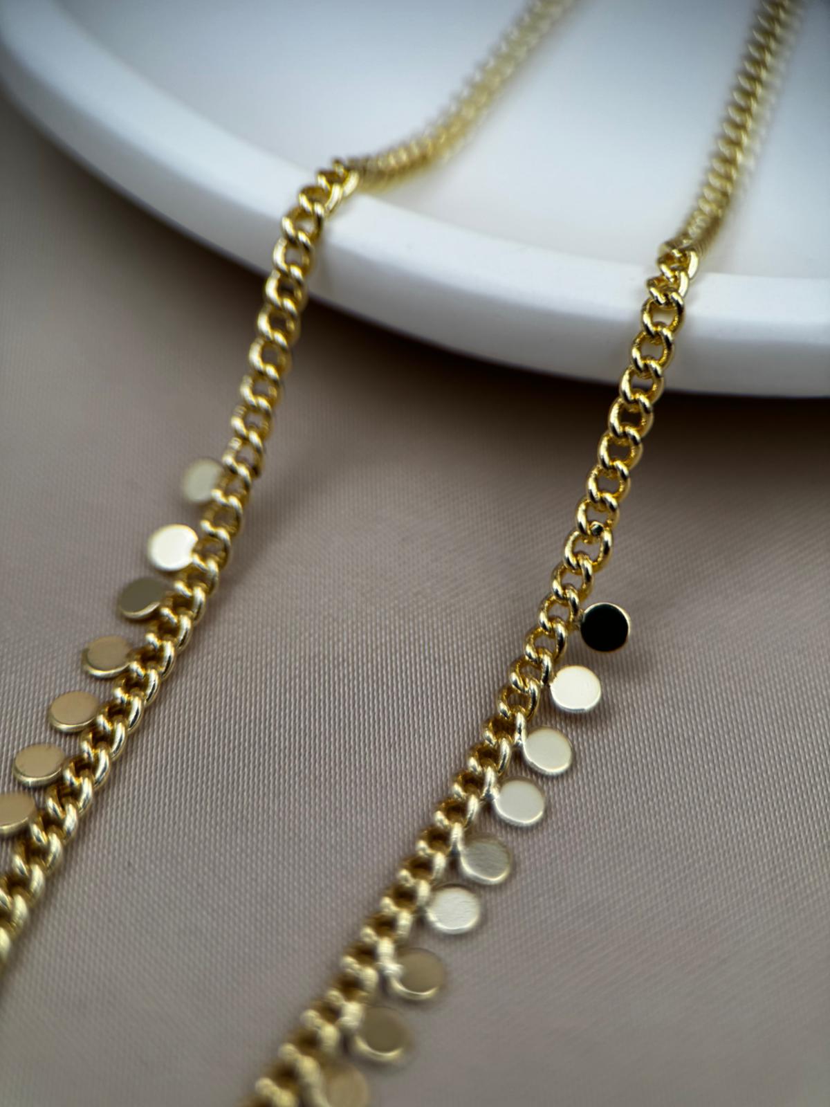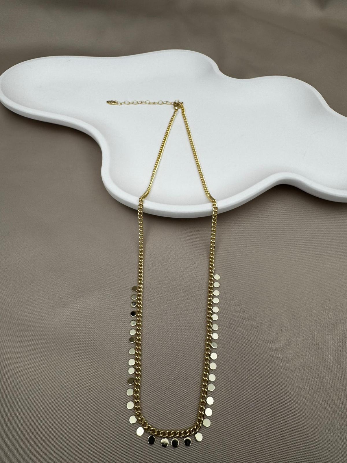 LUSEDA’nın zamansız şıklığını yansıtan bu altın tonlu disk detaylı zincir kolye, her hareketinizde ışığı yakalayarak zarif bir parlaklık oluşturur. Minimal ama dikkat çekici tasarımıyla hem günlük kombinlerde hem de özel davetlerde modern bir dokunuş sağlar.