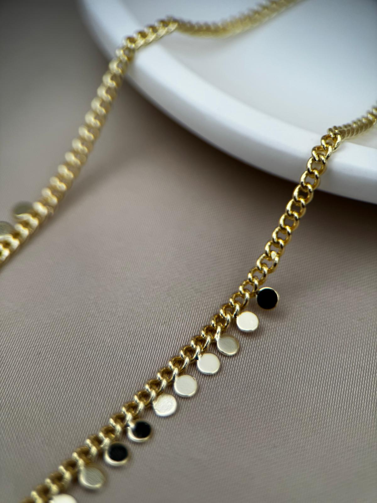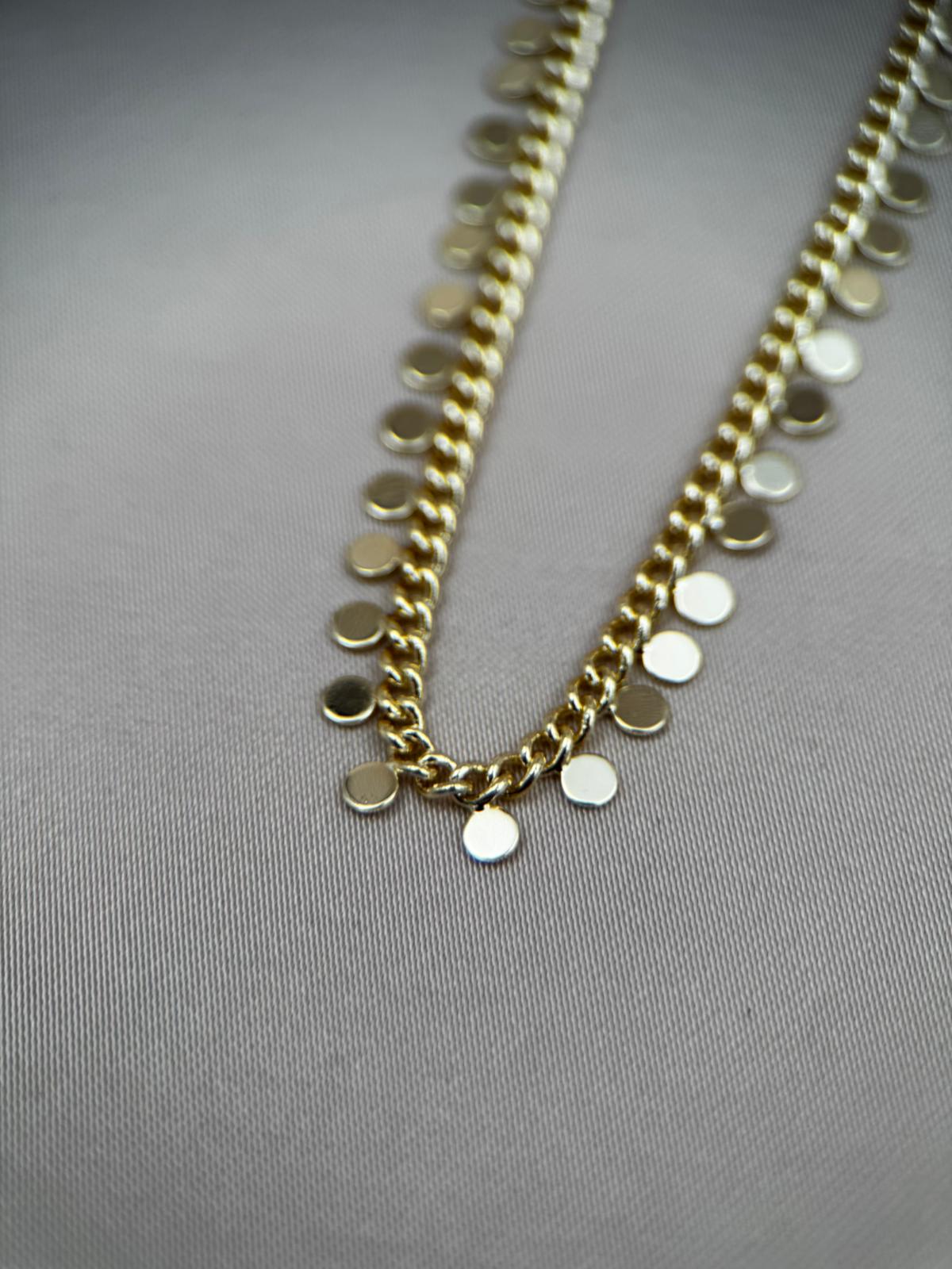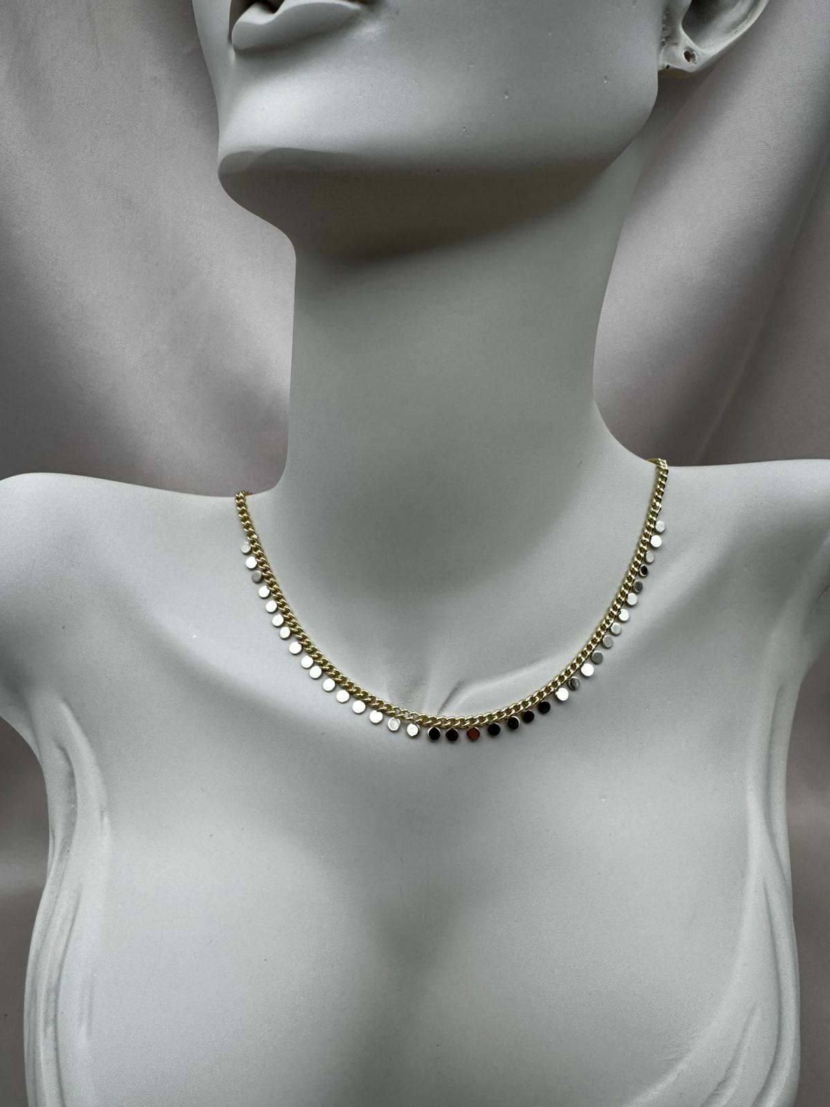 LUSEDA’nın zamansız şıklığını yansıtan bu altın tonlu disk detaylı zincir kolye, her hareketinizde ışığı yakalayarak zarif bir parlaklık oluşturur. Minimal ama dikkat çekici tasarımıyla hem günlük kombinlerde hem de özel davetlerde modern bir dokunuş sağlar.