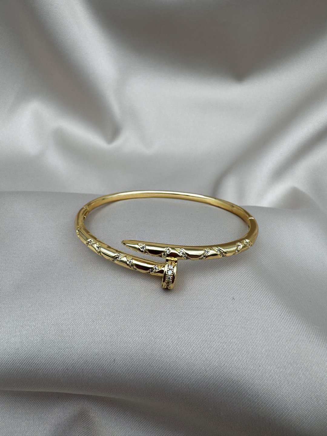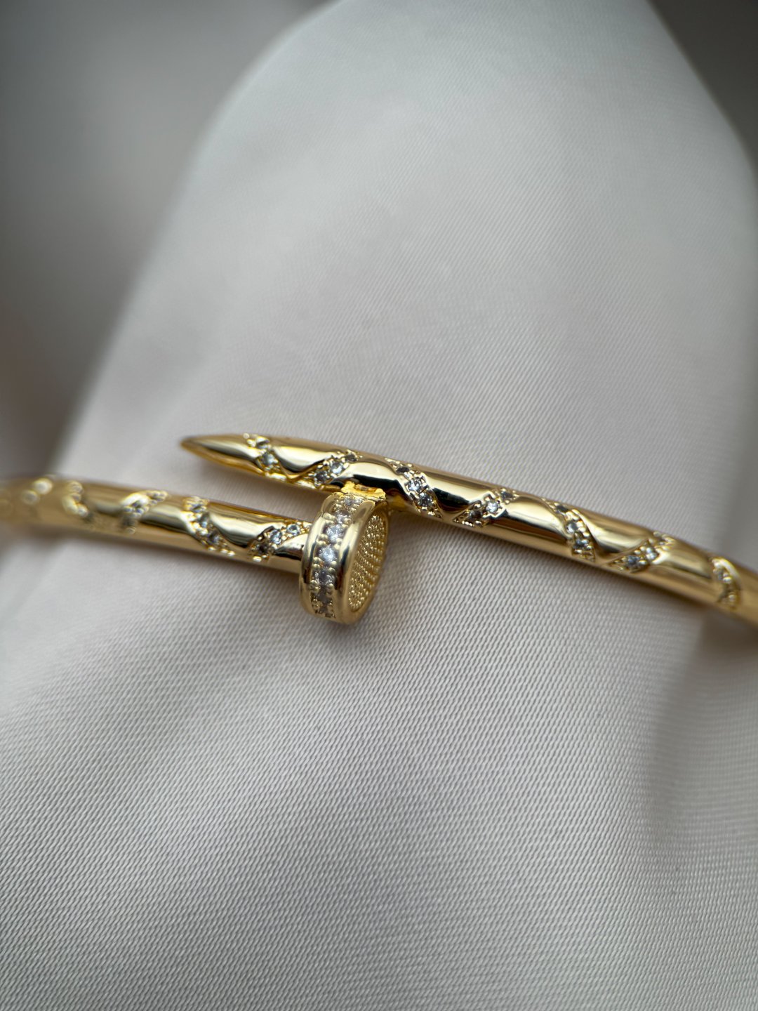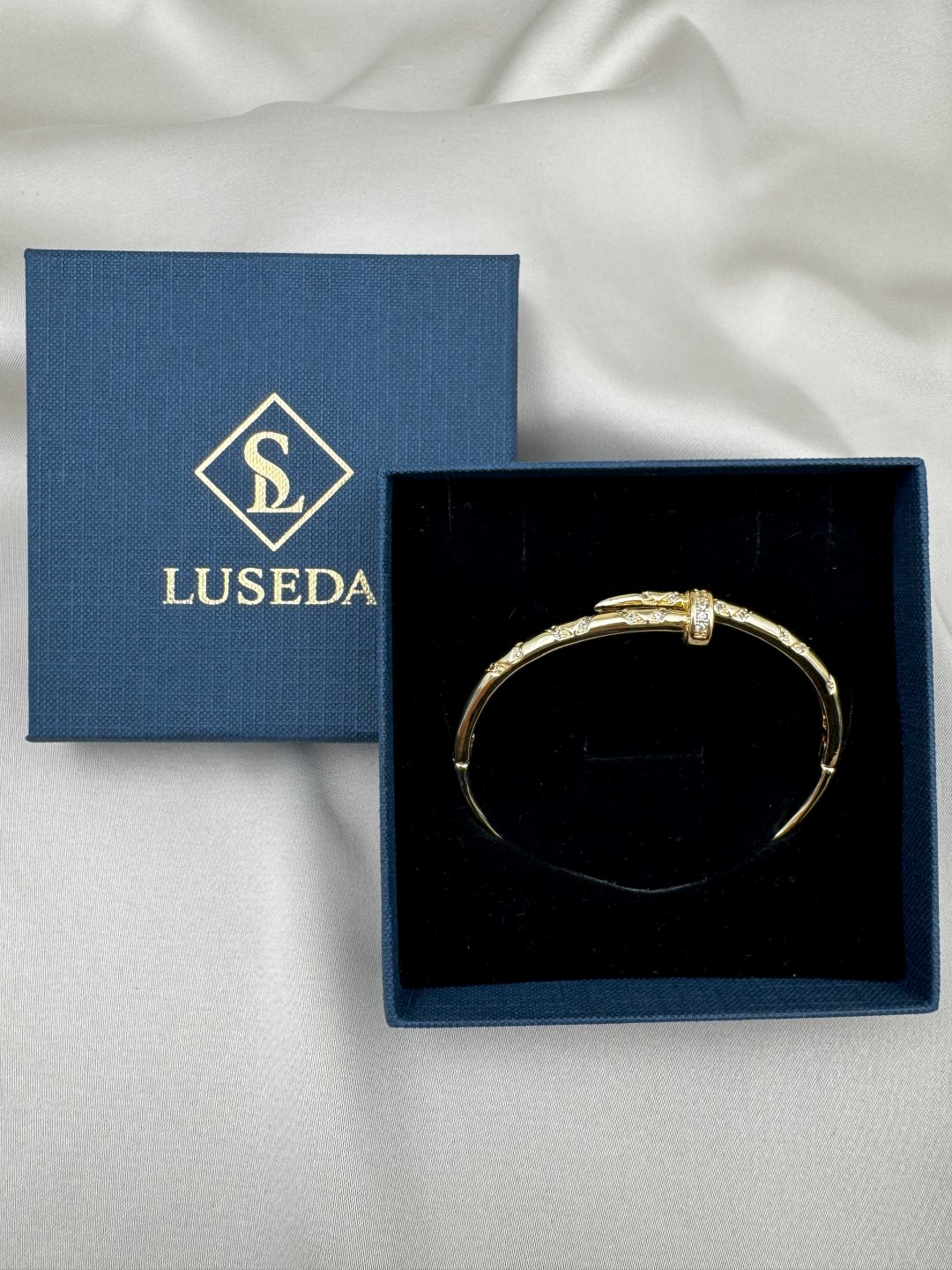 LUSEDA’nın zarif detaylarla tasarlanan bu zirkon taşlı vidalı bilekliği, modern lüksü sade bir formda sunar. Altın renkli kararmaz çelik materyali sayesinde uzun ömürlü kullanım sağlar; su, parfüm ve nem gibi etkenlere karşı yüksek dayanıklılığa sahiptir. Parlak zirkon taşlar, ışığı her açıdan zarif bir şekilde yansıtarak bileğe dikkat çekici bir ışıltı katar. Minimal çizgileri ve zarif formuyla hem gündelik stillerde hem de özel davetlerde kusursuz bir tamamlayıcıdır.