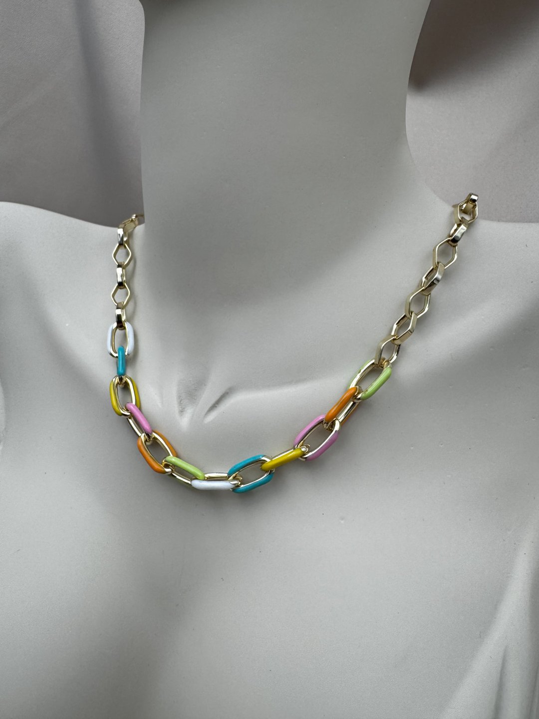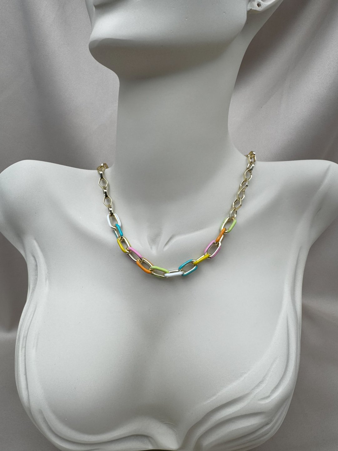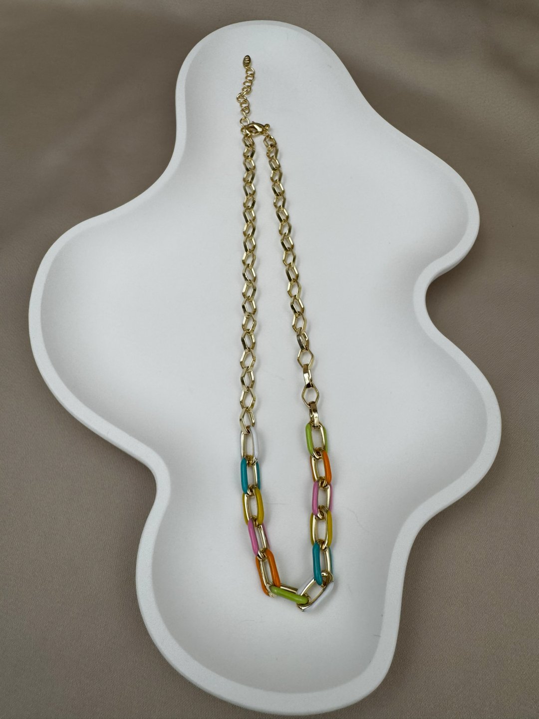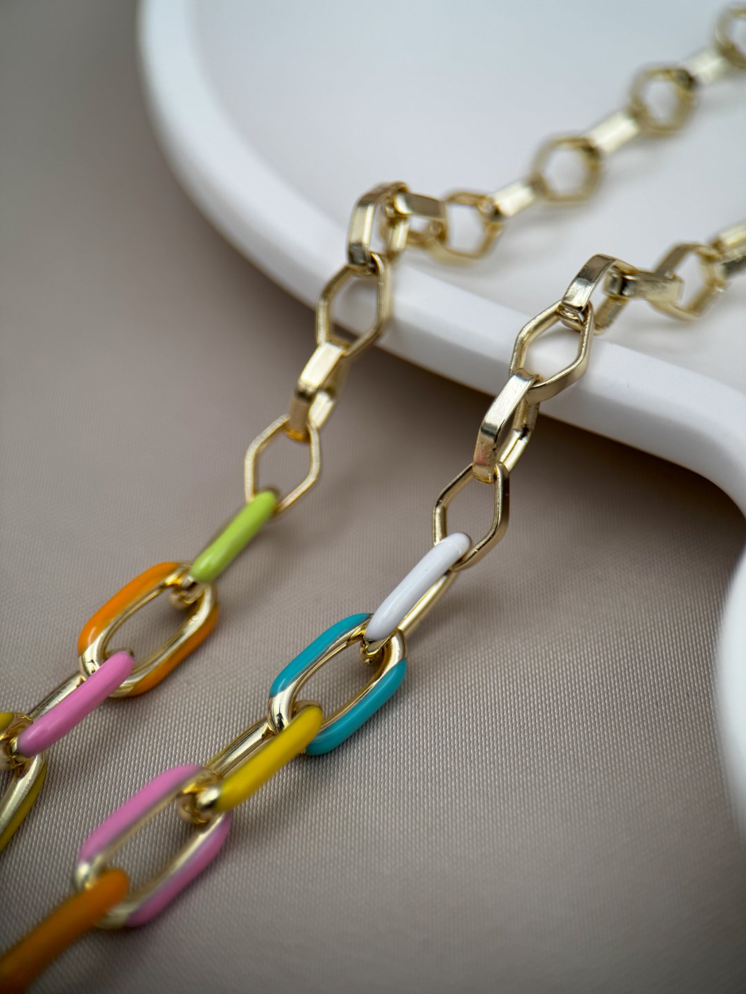 LUSEDA’nın enerjik ve modern çizgisini yansıtan bu renkli halkalı gold zincir kolye, canlı renk geçişleriyle tarzınıza dinamik bir dokunuş katar. Parlak altın tonlu halkalar, pembe, yeşil, turuncu, mavi ve beyaz renk detaylarıyla birleşerek modern bir görünüm sunar. Kararmaz yapısı sayesinde uzun ömürlü kullanım sağlar ve ilk günkü parlaklığını korur. Günlük kombinlerde eğlenceli bir şıklık oluştururken, özel davetlerde de enerjik bir zarafet sunar.