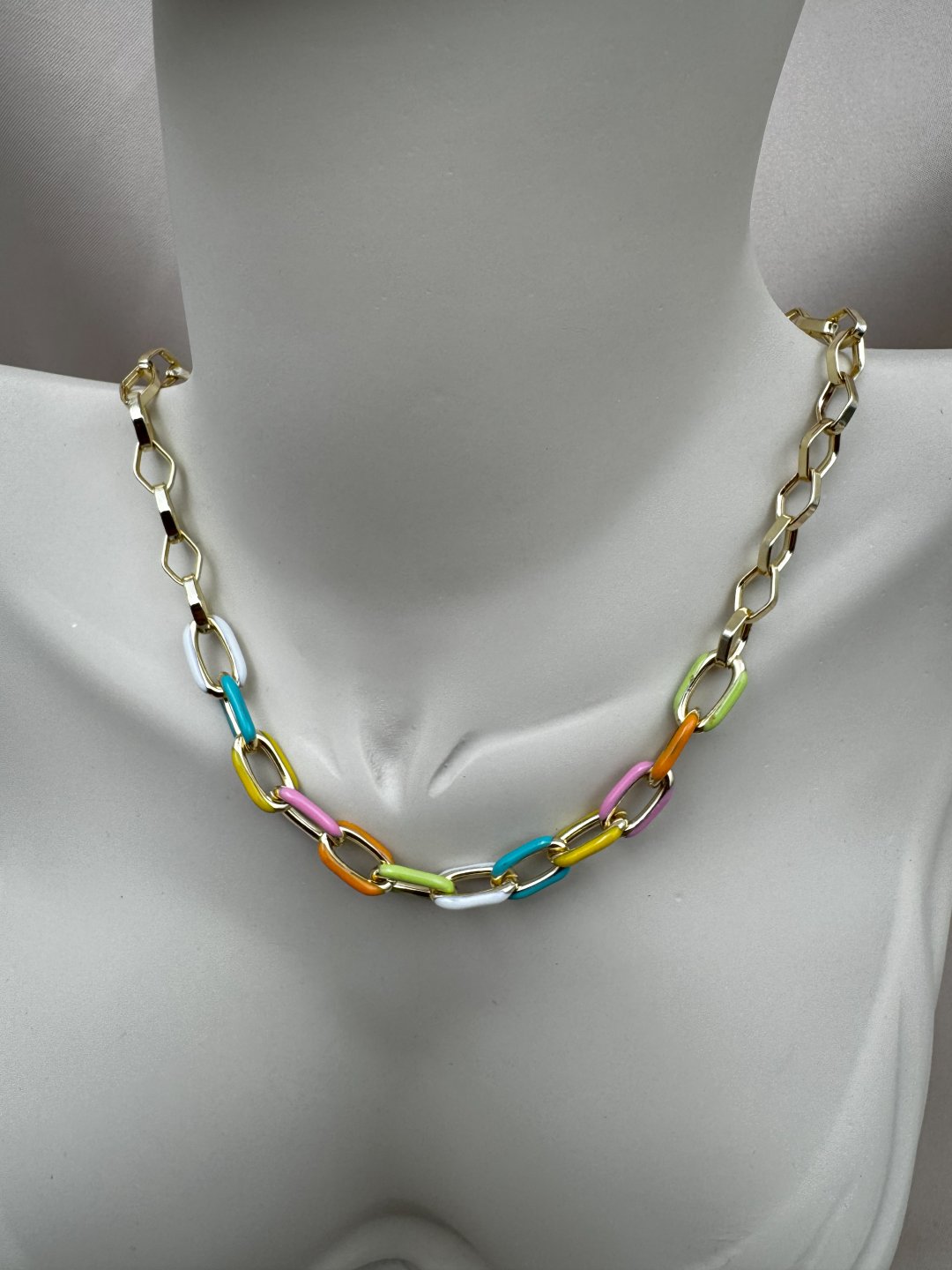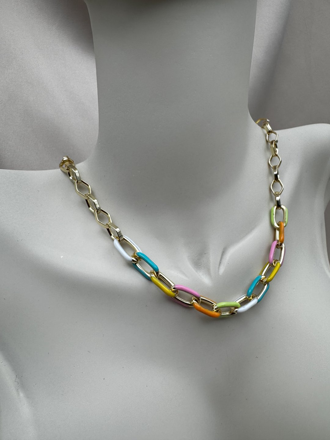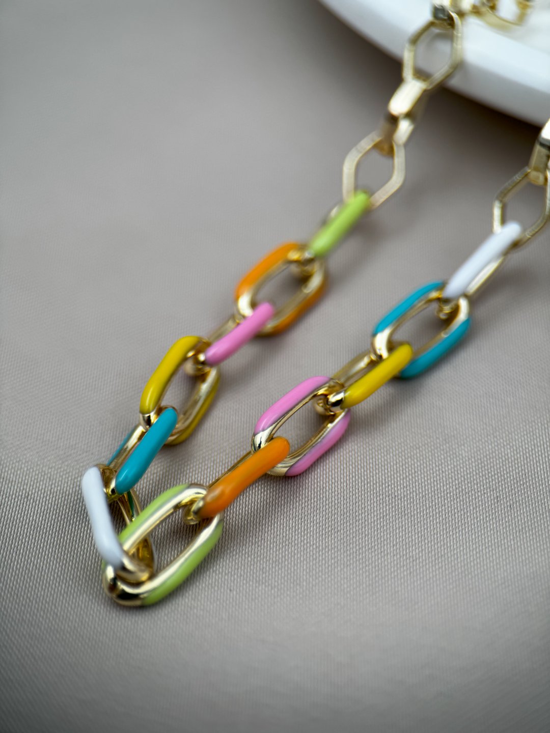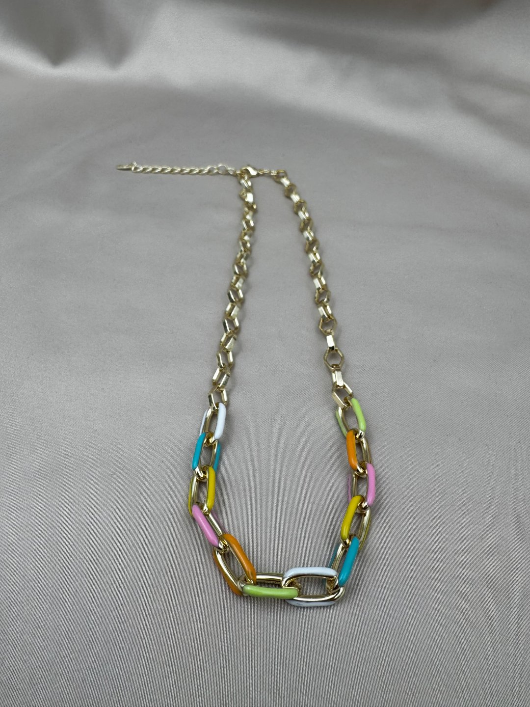 LUSEDA’nın enerjik ve modern çizgisini yansıtan bu renkli halkalı gold zincir kolye, canlı renk geçişleriyle tarzınıza dinamik bir dokunuş katar. Parlak altın tonlu halkalar, pembe, yeşil, turuncu, mavi ve beyaz renk detaylarıyla birleşerek modern bir görünüm sunar. Kararmaz yapısı sayesinde uzun ömürlü kullanım sağlar ve ilk günkü parlaklığını korur. Günlük kombinlerde eğlenceli bir şıklık oluştururken, özel davetlerde de enerjik bir zarafet sunar.
