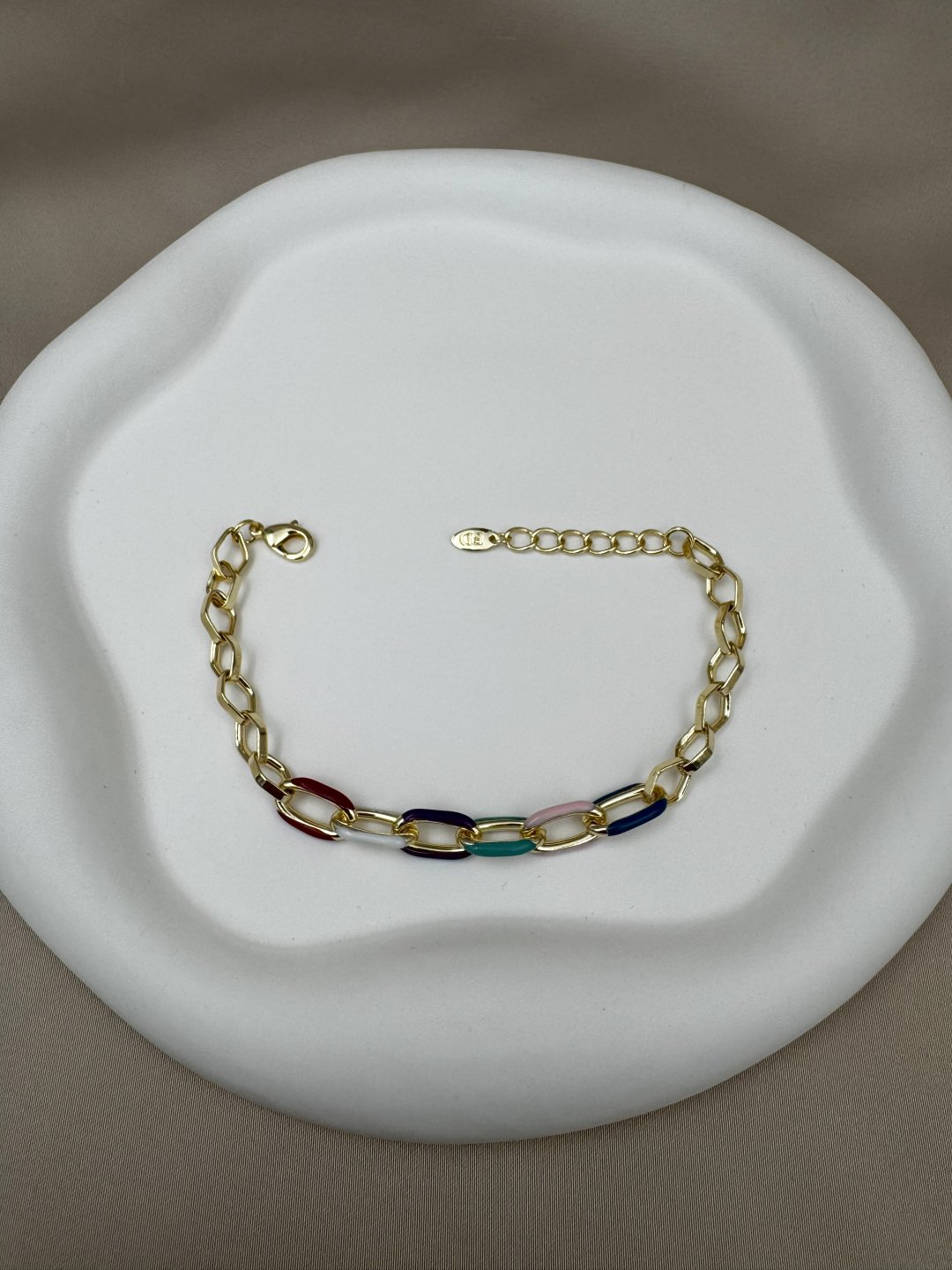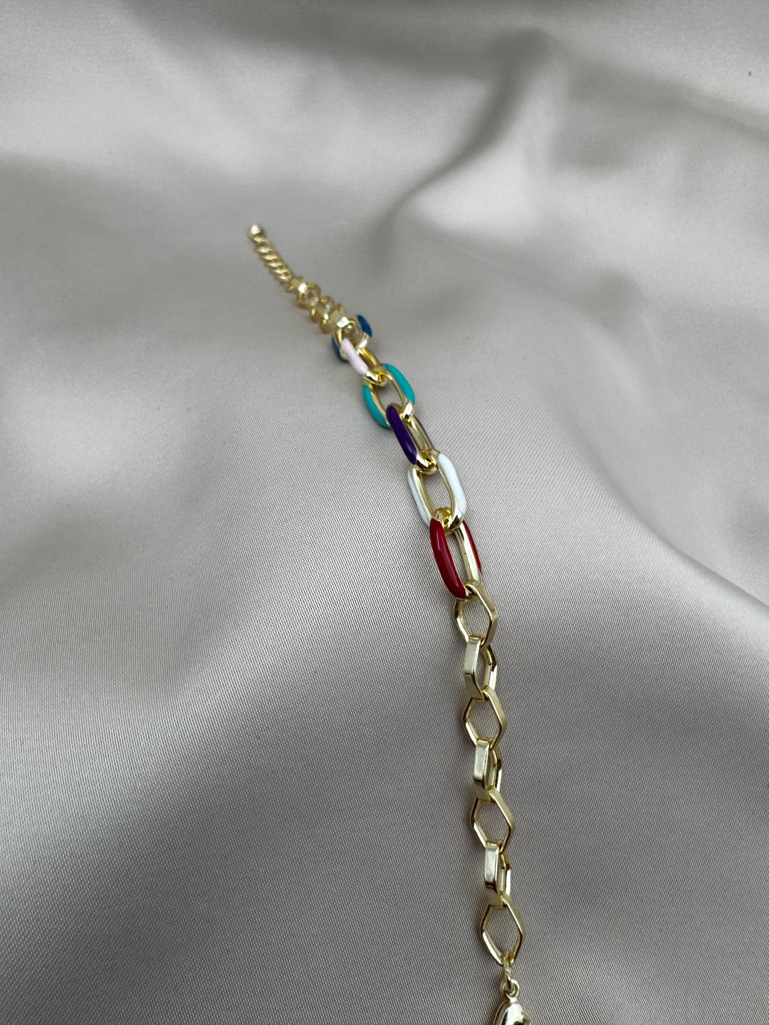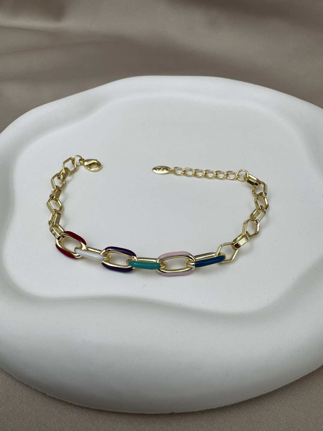 LUSEDA’nın enerjik ve modern tarzını yansıtan bu renkli halkalı gold bileklik, canlı tonları ve zarif zincir formuyla dikkat çeker. Gold kaplama yüzeyi, pastel renklerle mükemmel bir uyum oluşturarak dinamik ve sofistike bir görünüm sunar. Kararmaz ve dayanıklı yapısı sayesinde uzun süre ilk günkü parlaklığını korur.