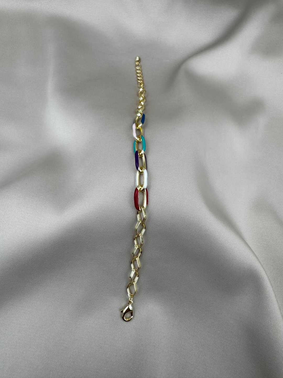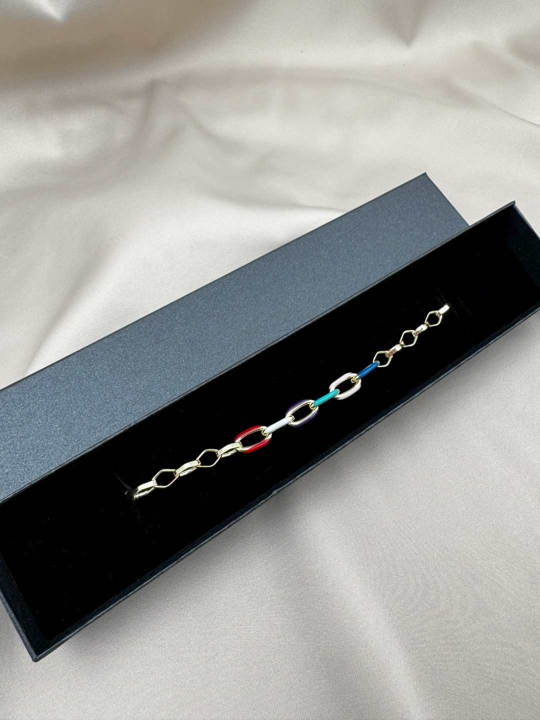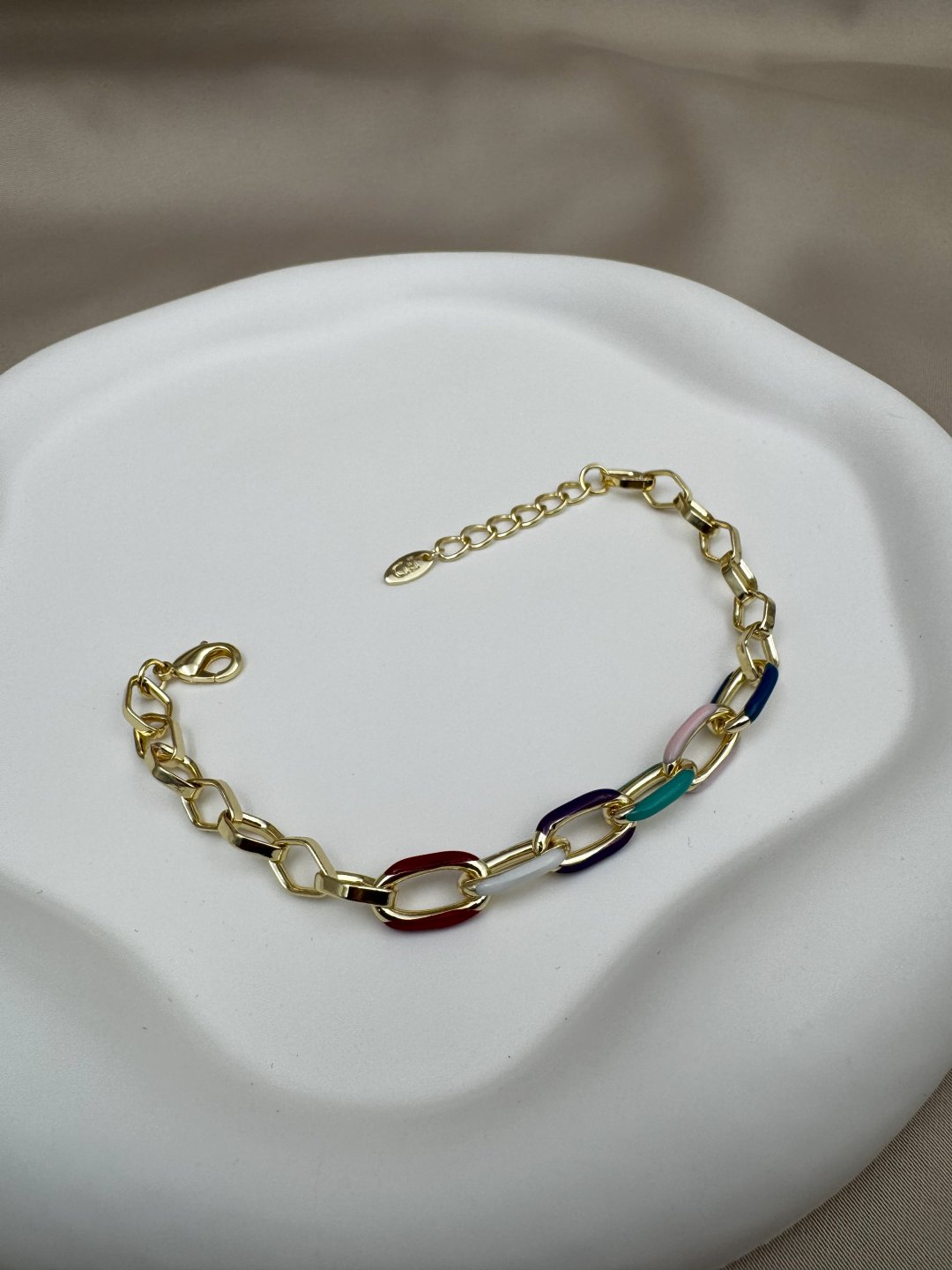 LUSEDA’nın enerjik ve modern tarzını yansıtan bu renkli halkalı gold bileklik, canlı tonları ve zarif zincir formuyla dikkat çeker. Gold kaplama yüzeyi, pastel renklerle mükemmel bir uyum oluşturarak dinamik ve sofistike bir görünüm sunar. Kararmaz ve dayanıklı yapısı sayesinde uzun süre ilk günkü parlaklığını korur.