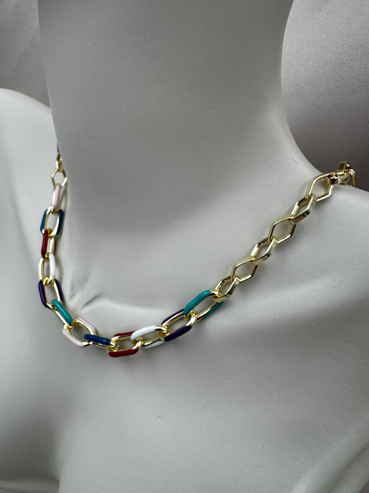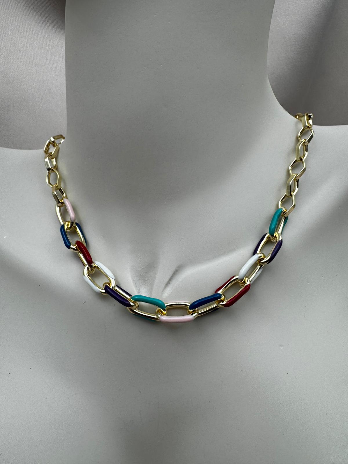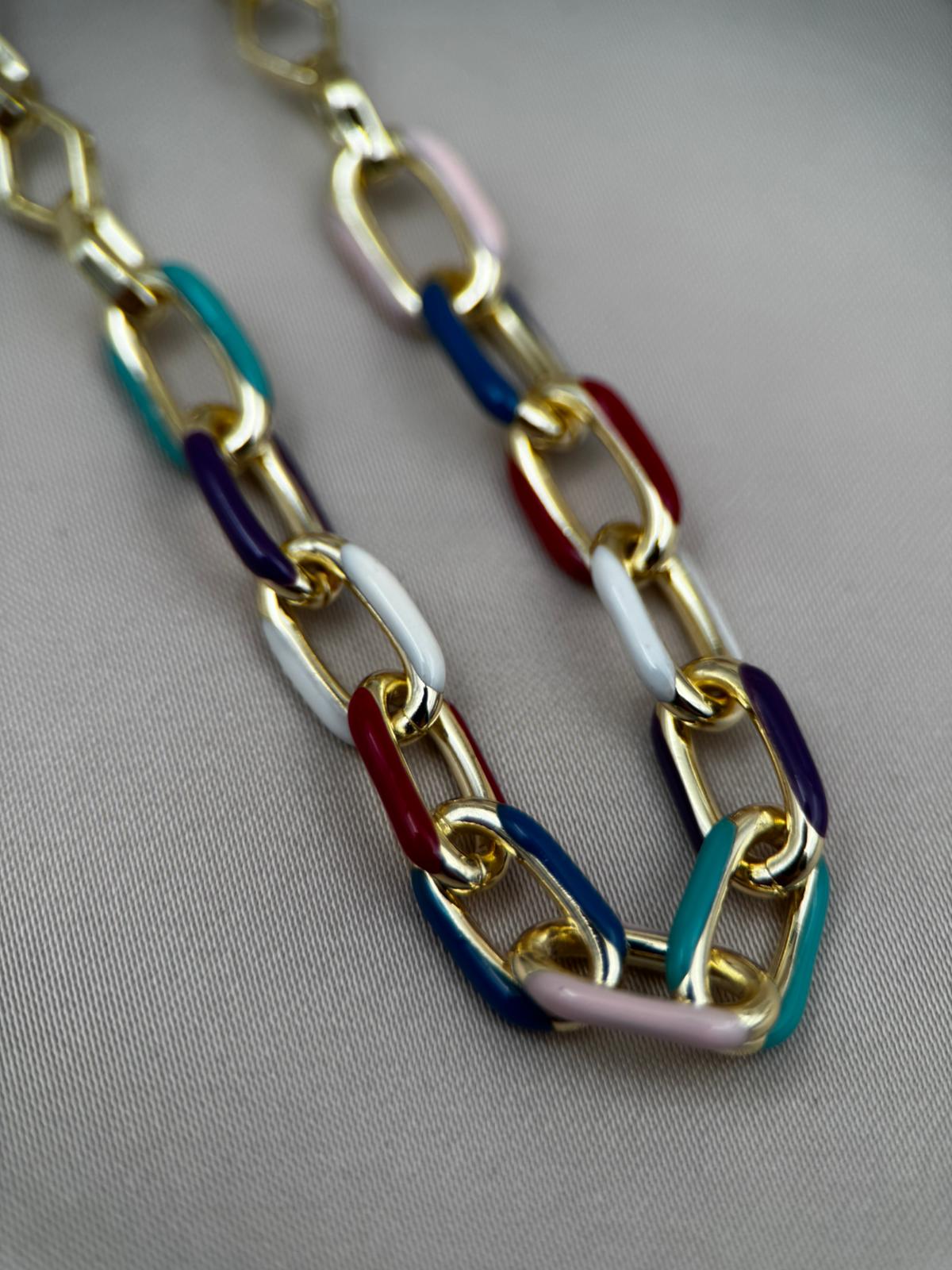 LUSEDA’nın zamansız şıklığını yansıtan bu renkli mine detaylı zincir kolye, altın tonlu halkalarıyla ışıltılı bir görünüm sunar. Canlı renk geçişleri sayesinde hem günlük kombinlere enerjik bir dokunuş katar hem de özel günlerde stilinizi modern bir zarafetle tamamlar. Hafif ve konforlu yapısıyla gün boyu rahatça kullanılabilir.