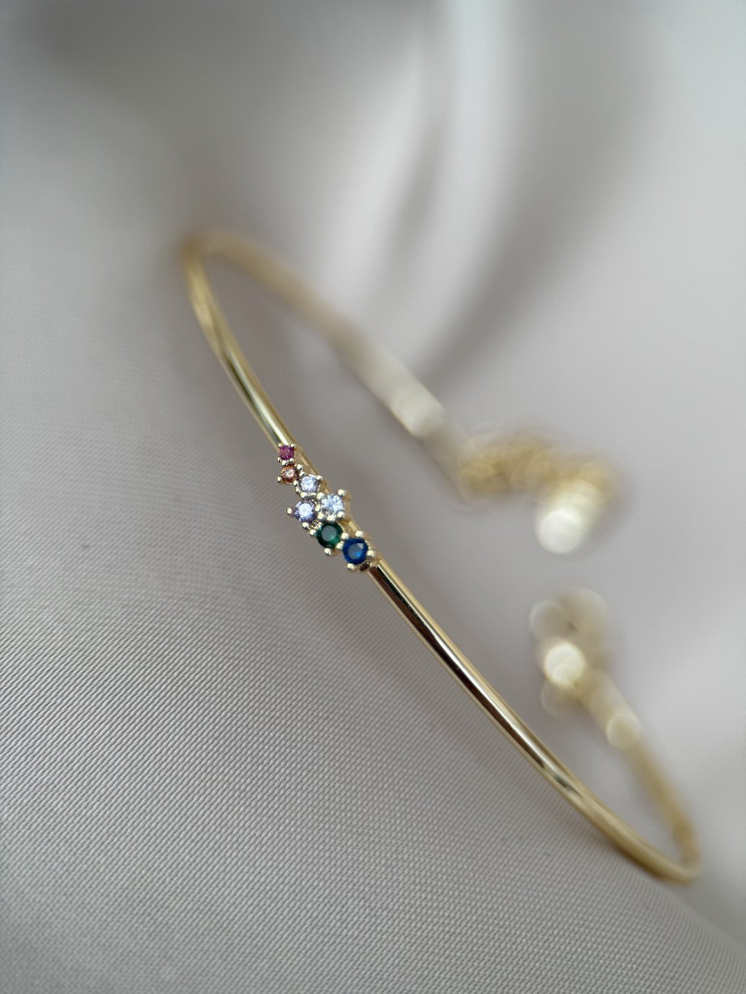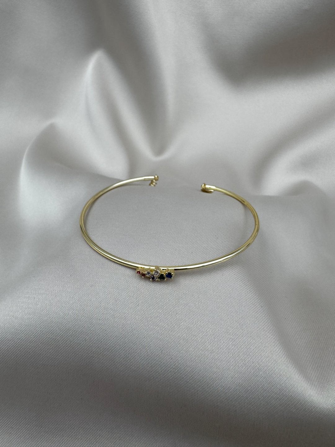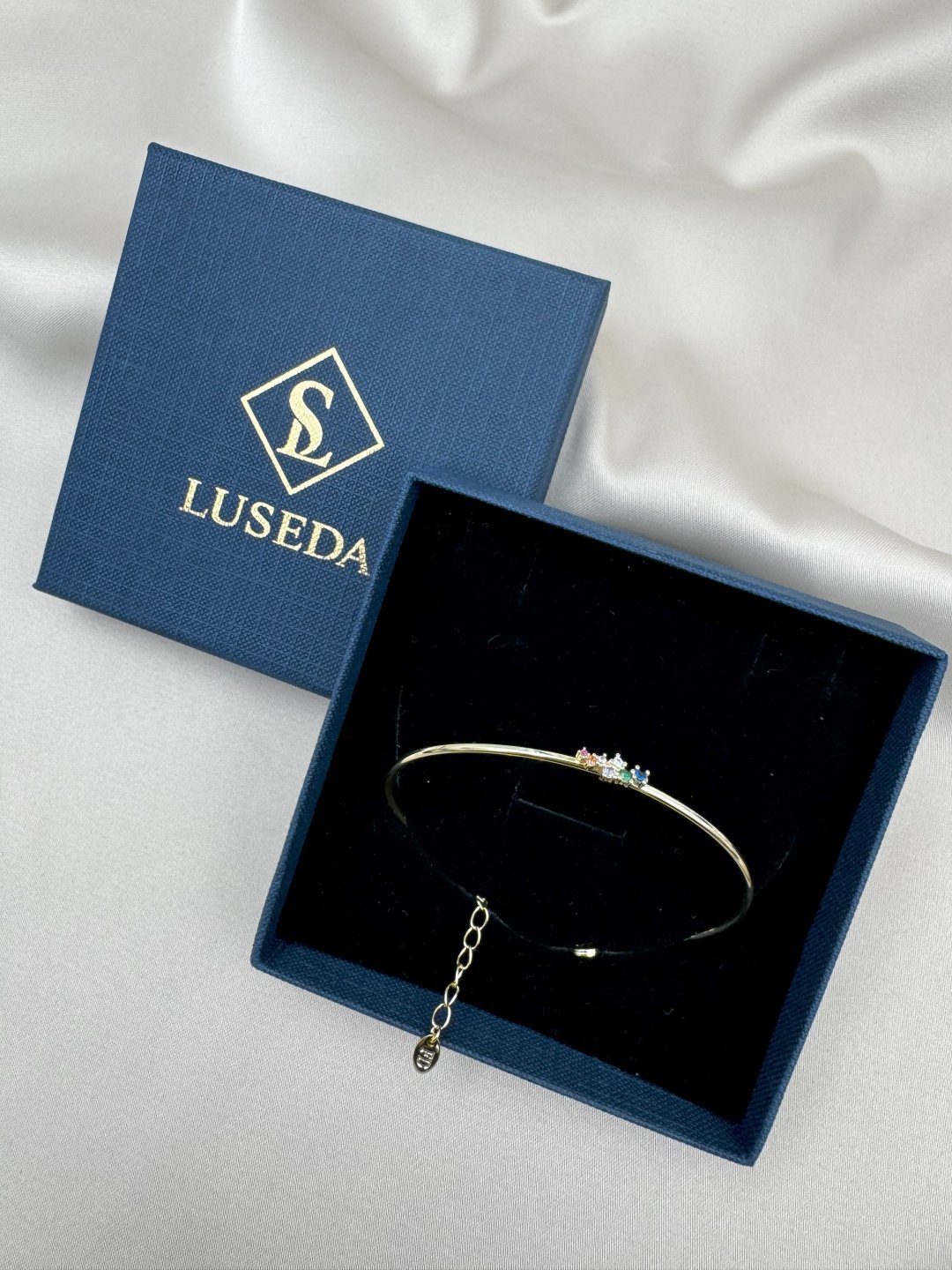 LUSEDA’nın zarafetiyle tasarlanan bu ince bileklik, minimal çizgisi ve renkli taş detaylarıyla sade ama etkileyici bir görünüm sunar. Her biri özenle yerleştirilmiş çok renkli taşlar, bileğinize ışıltı katarken stilinizi zarif bir dokunuşla tamamlar. Hafif yapısı sayesinde gün boyu rahatlıkla kullanılabilir; ister günlük kombinlerinize modern bir şıklık, ister özel davetlerde sofistike bir detay ekleyin. Altın tonunun sıcak ışıltısı, farklı renklerdeki taşlarla mükemmel bir uyum yakalar. LUSEDA kalitesiyle hazırlanan bu özel tasarım bileklik, kendiniz veya sevdikleriniz için zarif bir hediye seçeneğidir.