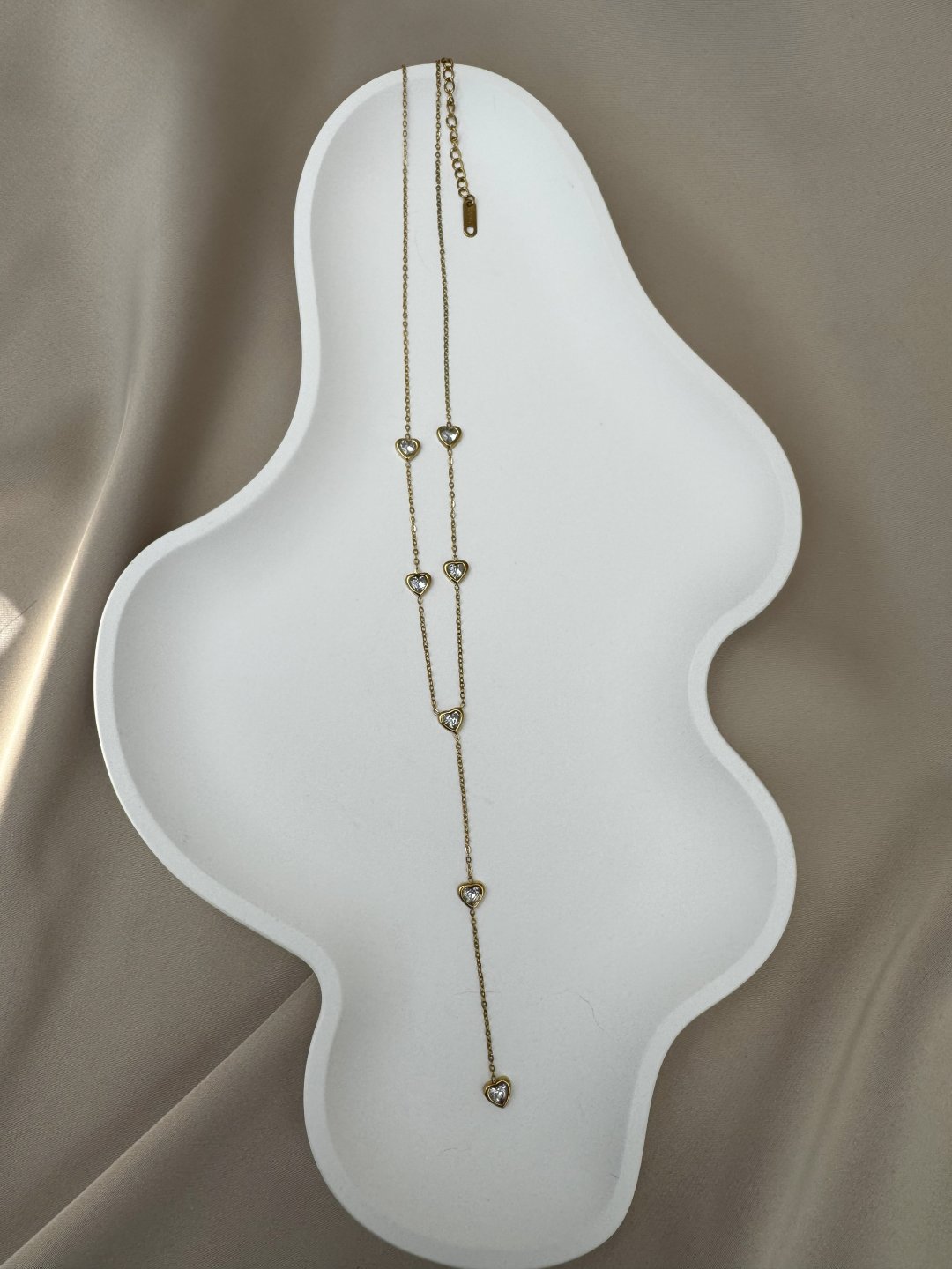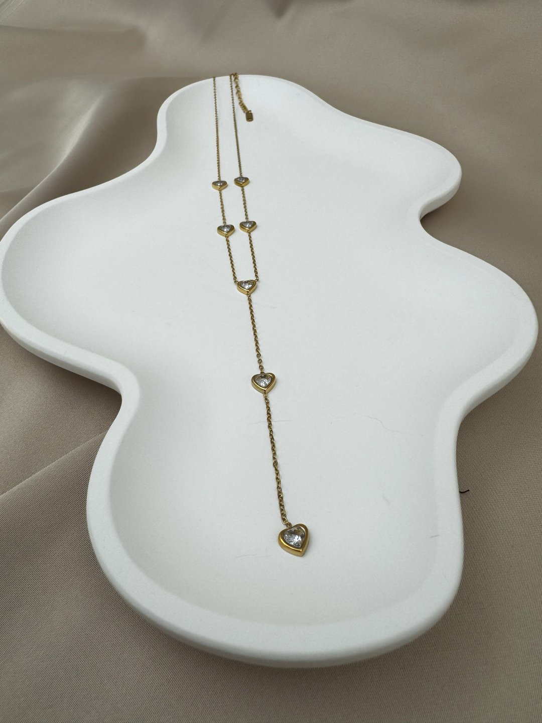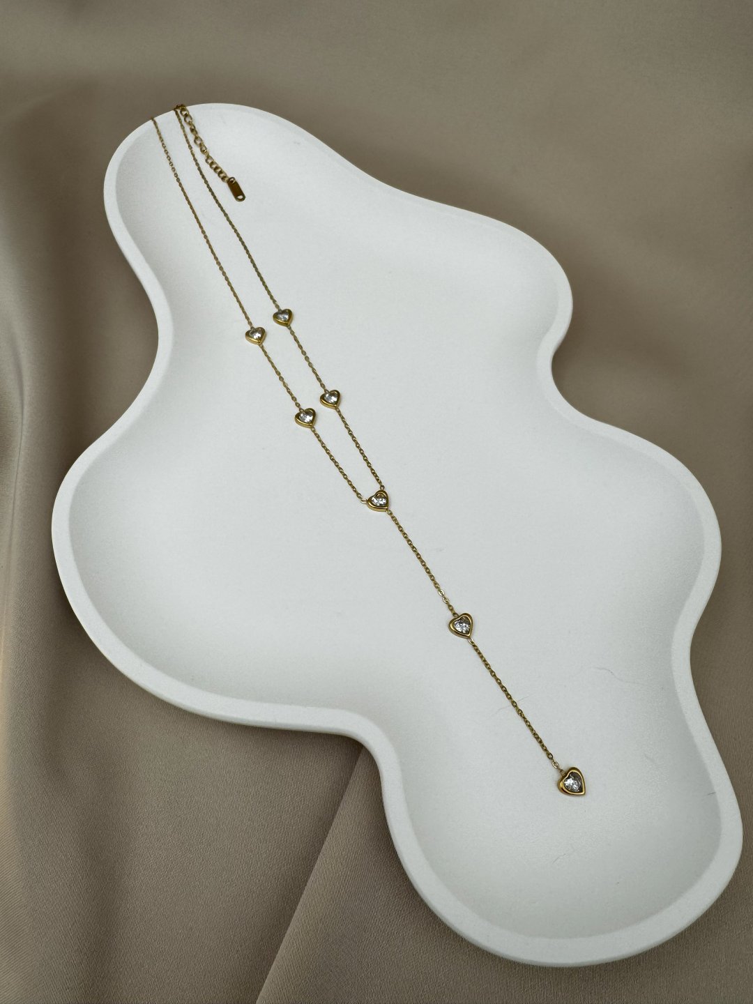 LUSEDA’nın zarafetle tasarladığı bu kalp model taşlı kolye, romantik detayları ve modern formu bir araya getiriyor. Altın tonlu zinciri ve her biri özenle işlenmiş zirkon taş kalp motifleriyle ışığı zarifçe yansıtır. Kararmaz çelik yapısı sayesinde uzun ömürlü kullanım sunarken, cilt dostu yapısıyla konforlu bir takma deneyimi sağlar.