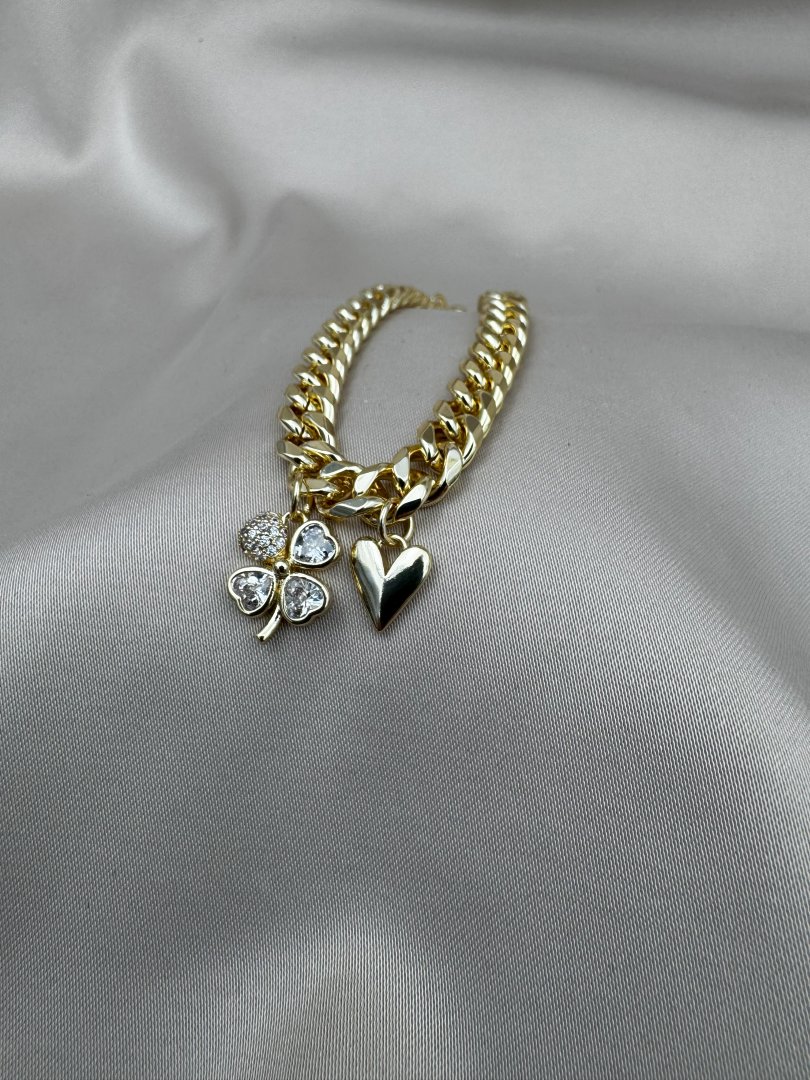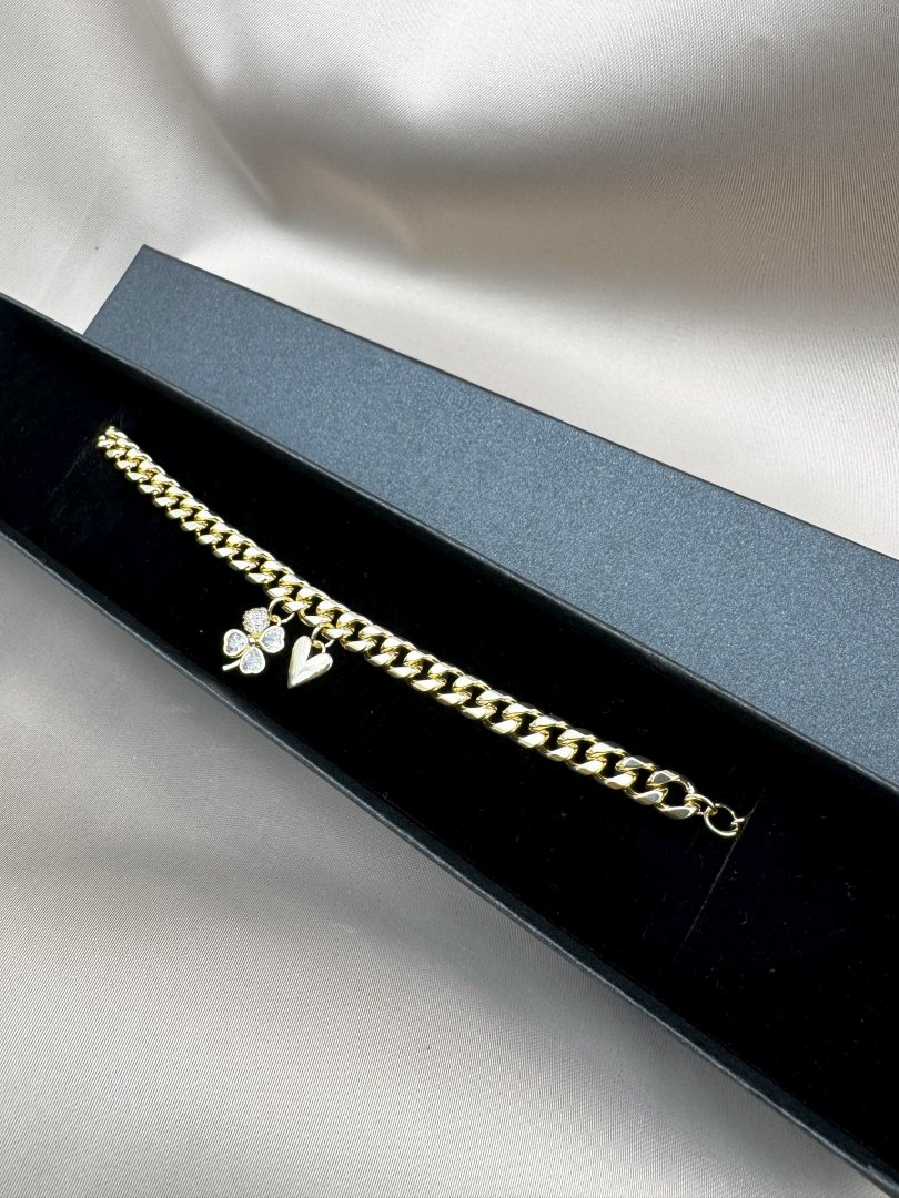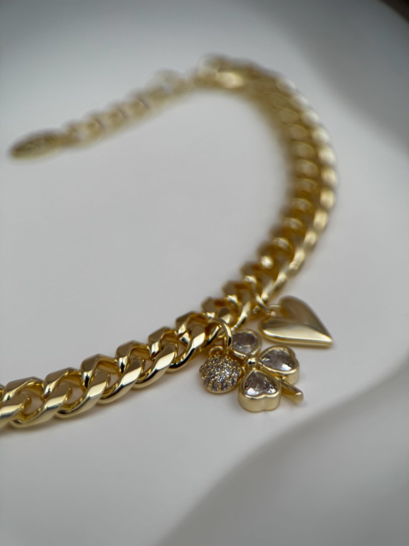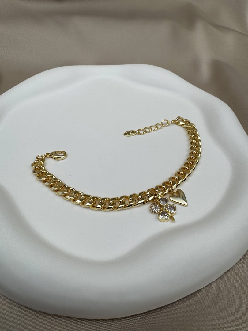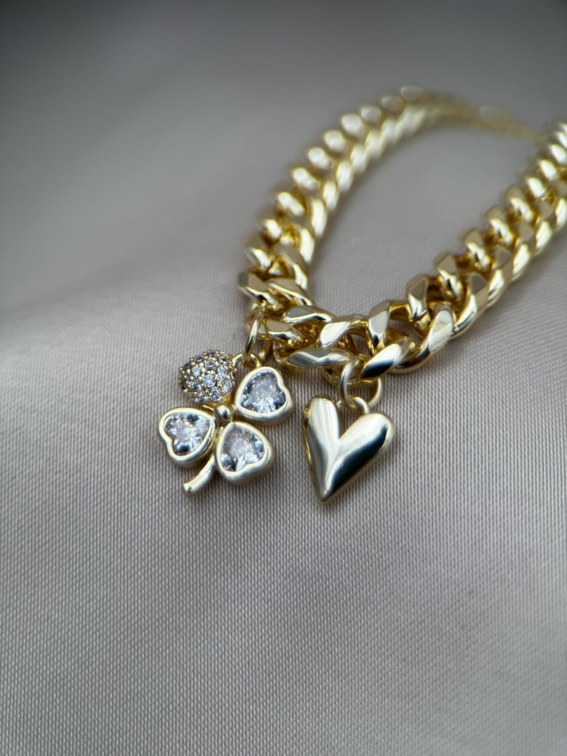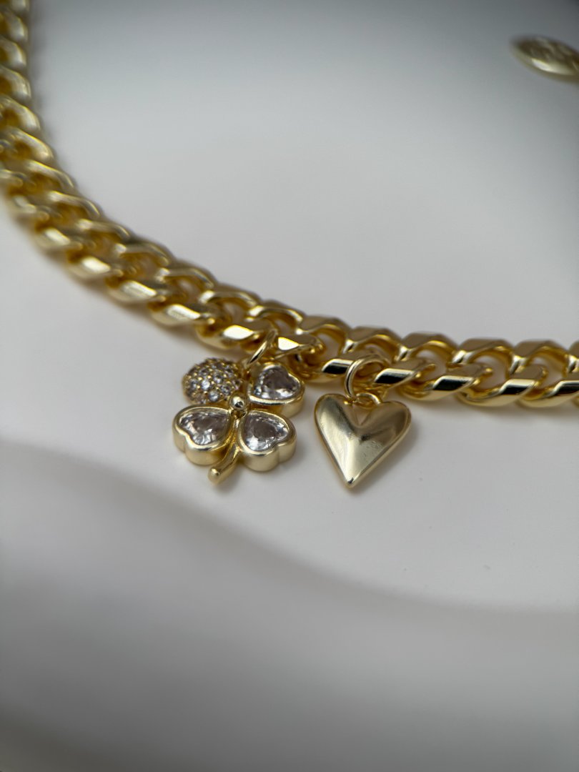 LUSEDA’nın zarif dokunuşuyla tasarlanan bu özel kadın bileklik, kararmaz çelik malzemeden üretilmiş olup uzun süre ilk günkü parlaklığını korur. Altın rengi kalın zincir formu, modern şıklığıyla dikkat çekerken; yonca ve kalp charm detayları bilekliğe hem anlam hem de romantik bir hava katar. Günlük kombinlerden özel davetlere kadar her ortamda zarafetinizi ön plana çıkaran bu bileklik, sevdiklerinize hediye olarak da ideal bir seçimdir. LUSEDA ile stilinize hem şıklık hem de anlam katın.