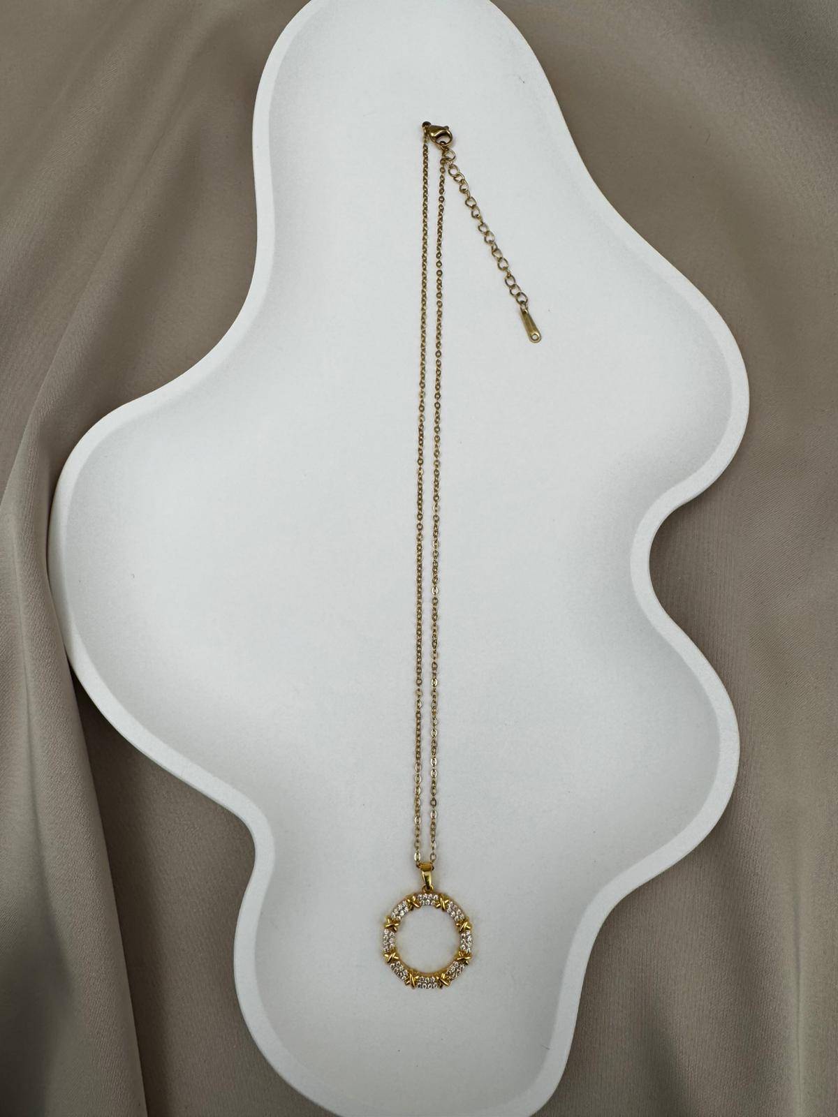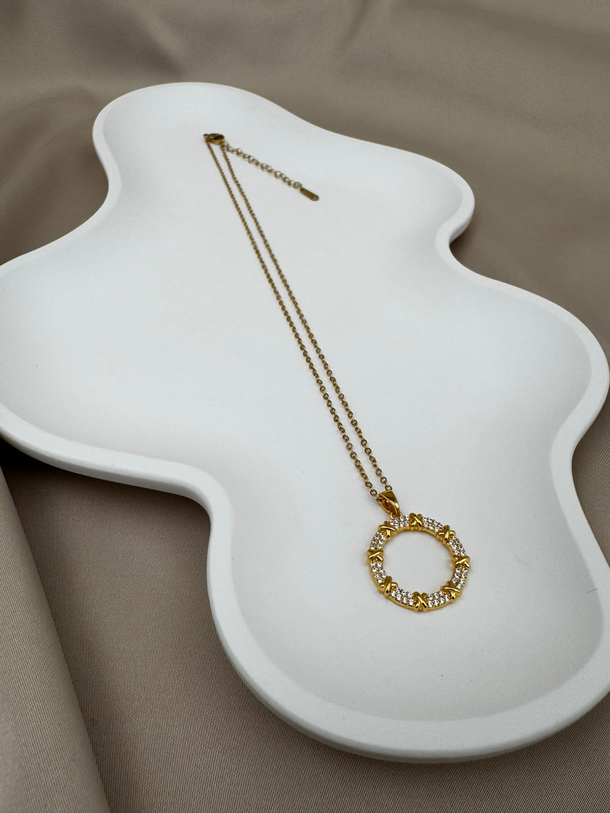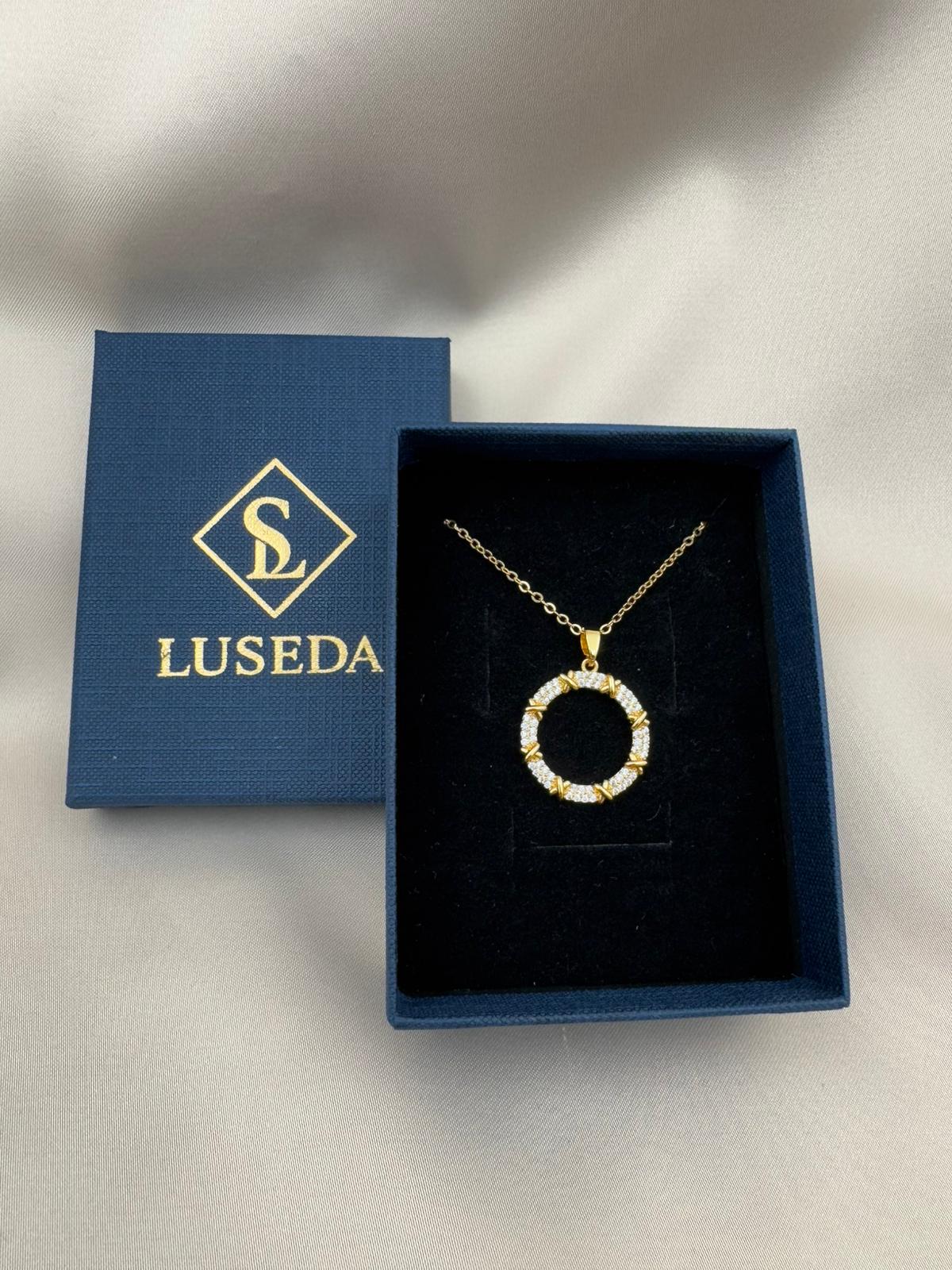 LUSEDA taşlı halka form kolye, modern ve klasik çizgileri buluşturan özel tasarımıyla öne çıkıyor. Kararmaz çelik üzerine altın kaplama detayları ve parlak taş işlemeleriyle uzun ömürlü bir ışıltı sunar. Günlük kombinlerden özel davetlere kadar her anınıza sofistike bir dokunuş katar. Hafif yapısıyla konforlu kullanım sağlayan bu kolye, stilinize elegan bir tamamlayıcı olacak.