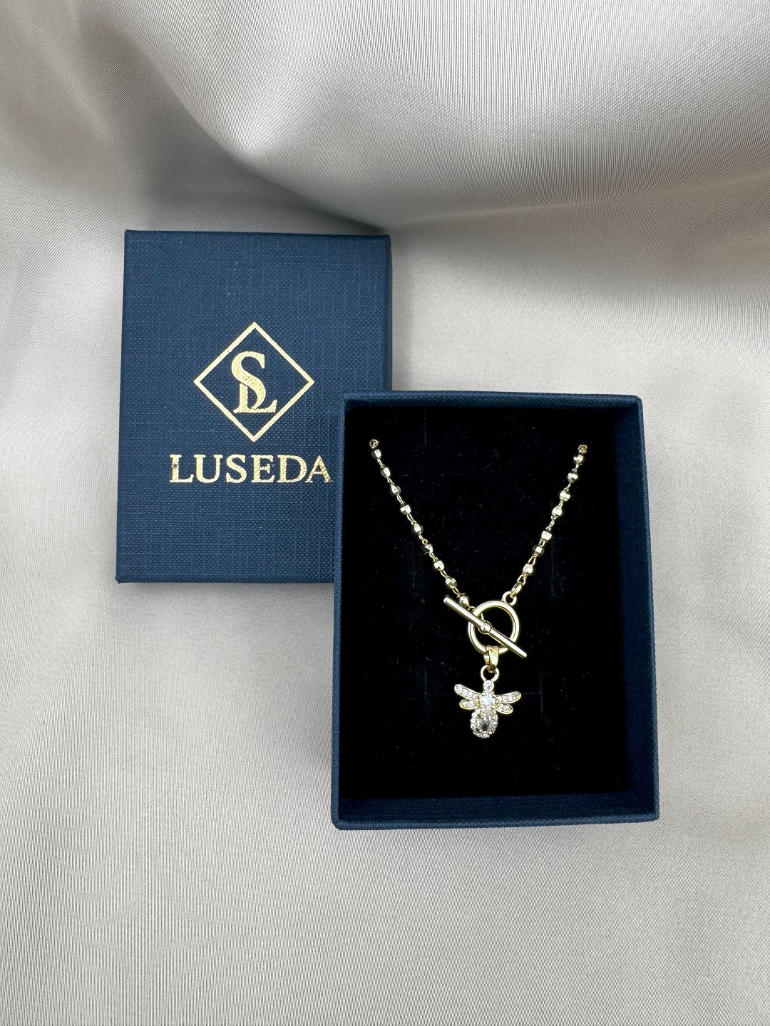 LUSEDA’nın zarif detaylarla tasarladığı bu altın renkli arı figürlü kolye, ışıltılı zirkon taşları ve modern zincir formu ile şıklığınızı ön plana çıkarır. Kararmaz ve dayanıklı yapısı sayesinde uzun ömürlü kullanım sunar. Günlük kombinlerinize zarafet katarak fark yaratırken, özel davetlerde de sofistike bir dokunuş sağlar. Arı figürünün zarafeti, doğadan ilham alan özgün bir enerji taşır. Şık kutu ambalajı sayesinde sevdiklerinize hediye etmeye de uygundur.